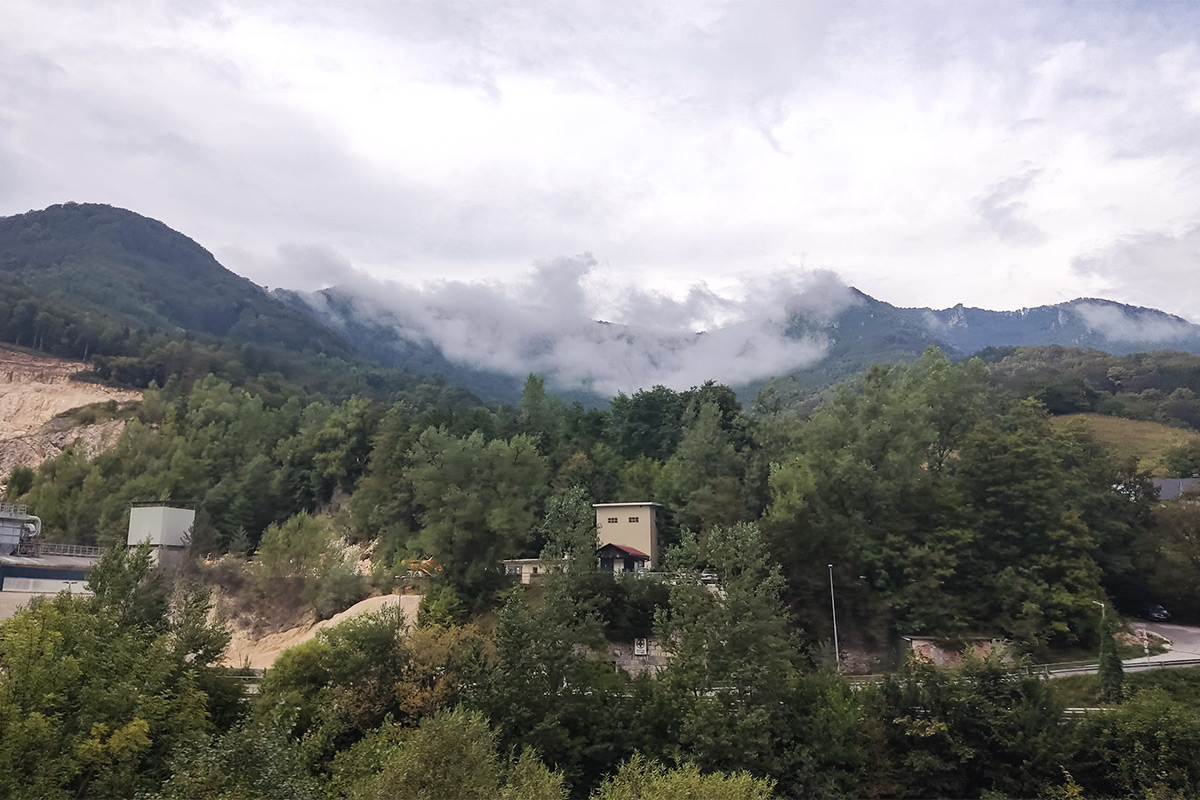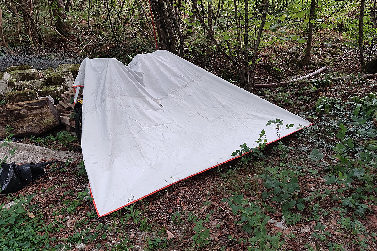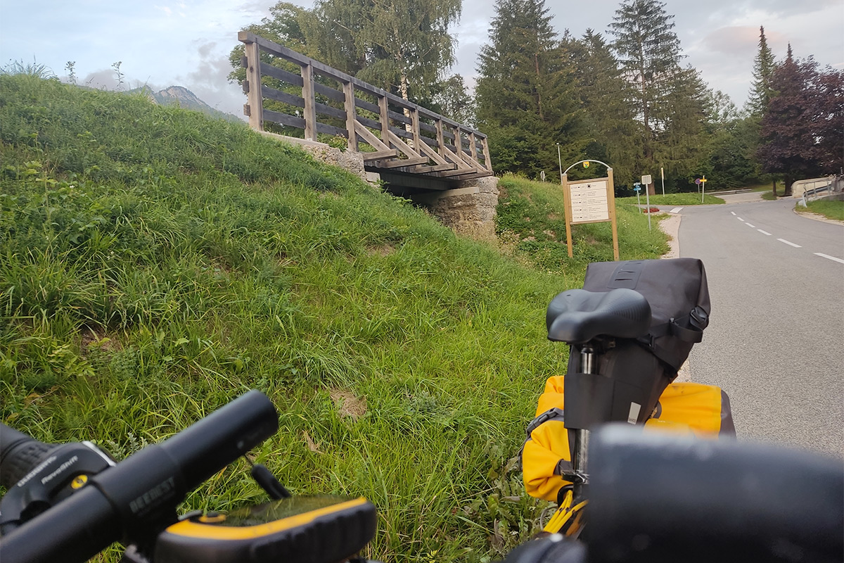 Ahogy haladtam Kobarid felé, egyre sötétebb felhők kezdtek megjelenni előttem. Néhány esőcsepp rám is esett útközben, de még nem volt vészes. Aztán úgy öt kilométerrel a település előtt láttam, hogy előttem már elkezd esni, az ég is egyre gyakrabban dörgött. Ráadásul a felhők is felém jöttek, úgy hogy félreálltam, a bringát nekitámasztottam egy farakásnak, és fölé húztam sátorszerűen a ponyvát. Nem kellett sokat várnom, hogy odaérjen az eső, úgy hogy én is bebújtam a ponyva alá.