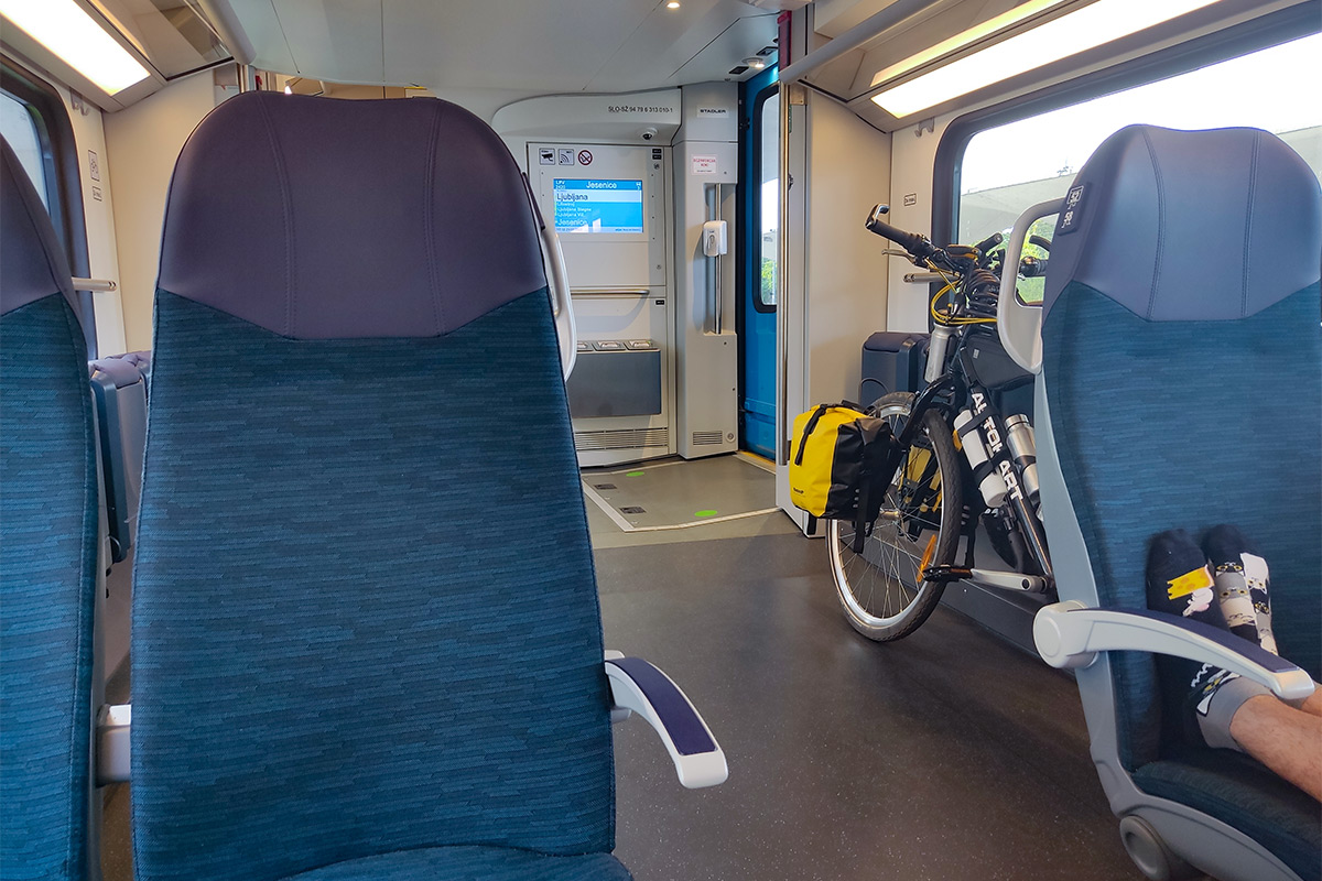 Ljubljanába jó félórás késéssel érkeztünk. A mellettünk lévő vágányon már bent állt a Jesenicébe tartó Stadler, körülbelül tizenöt perc volt az indulásig. Kevésnek tűnt, főleg, hogy a biciklivel kellett volna áthurcolkodnom az aluljárón. De épp érkezett a kalauz, és megkérdeztem, hogy a vonaton válthatok-e jegyet, és igen volt a válasz. Amúgy is úgy rémlik, mintha három éve is csak a vonatjegyet tudtam volna a pénztárnál megvenni, a kerékpárjegyet a vonaton adták. Az egyébként 1,5 euró (Ljubljana – Jesenice 5,8 euró), és az érvényesség napján korlátlan utazásra jogosítja a bringát.