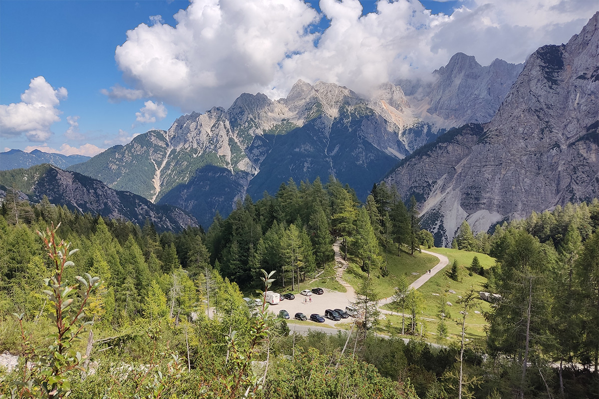 Huszonnégy számozott táblával jelölt hajtűkanyar van a hágóig az északi oldalon. És több kilátópont, ahol autóval is meg lehet állni, néhol padok is vannak, és információs táblák a hágótól, a környező hegyekről, a Triglav Nemzeti Parkról, ahol éppen vagyok.