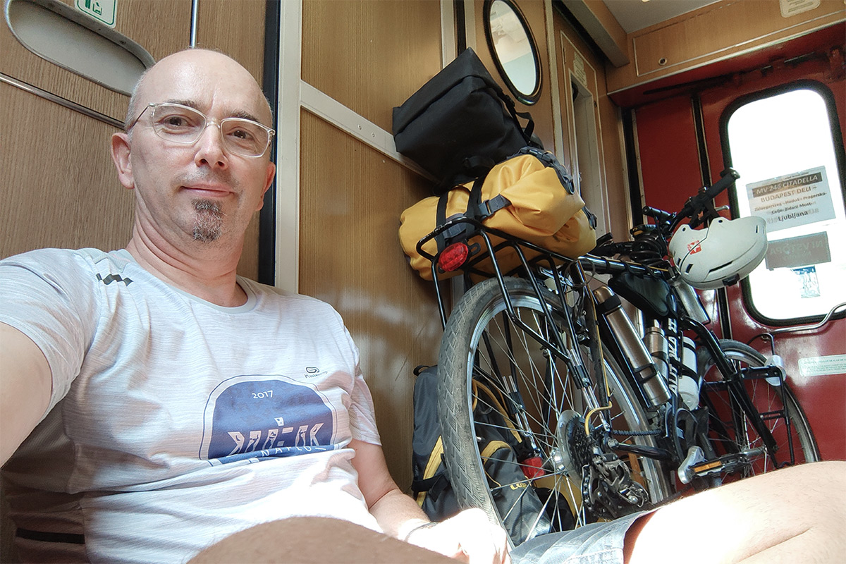 Ja, és azt nem is mondtam, hogy egy hatalmasat zakóztam, amikor szálltam le a bringával. Valószínűleg a budapesti peron magasabb volt, és ezért úgy gondoltam, hogy simán le tudok szállni a bringával. De meglepődtem, mert alacsonyabban volt a talaj, mint amire számítottam, úgy hogy átestem a bringán. A vasutasok rögtön odajöttek összeszedni a palackokat, és a táskákat, ez utóbbiak az átszállás miatt csak rá voltak akasztva a bringára. Látszólag nem sérült semmi, majd Ljubljanában, ha ráülök, kiderül. Mondjuk van három tojás egy dobozban.