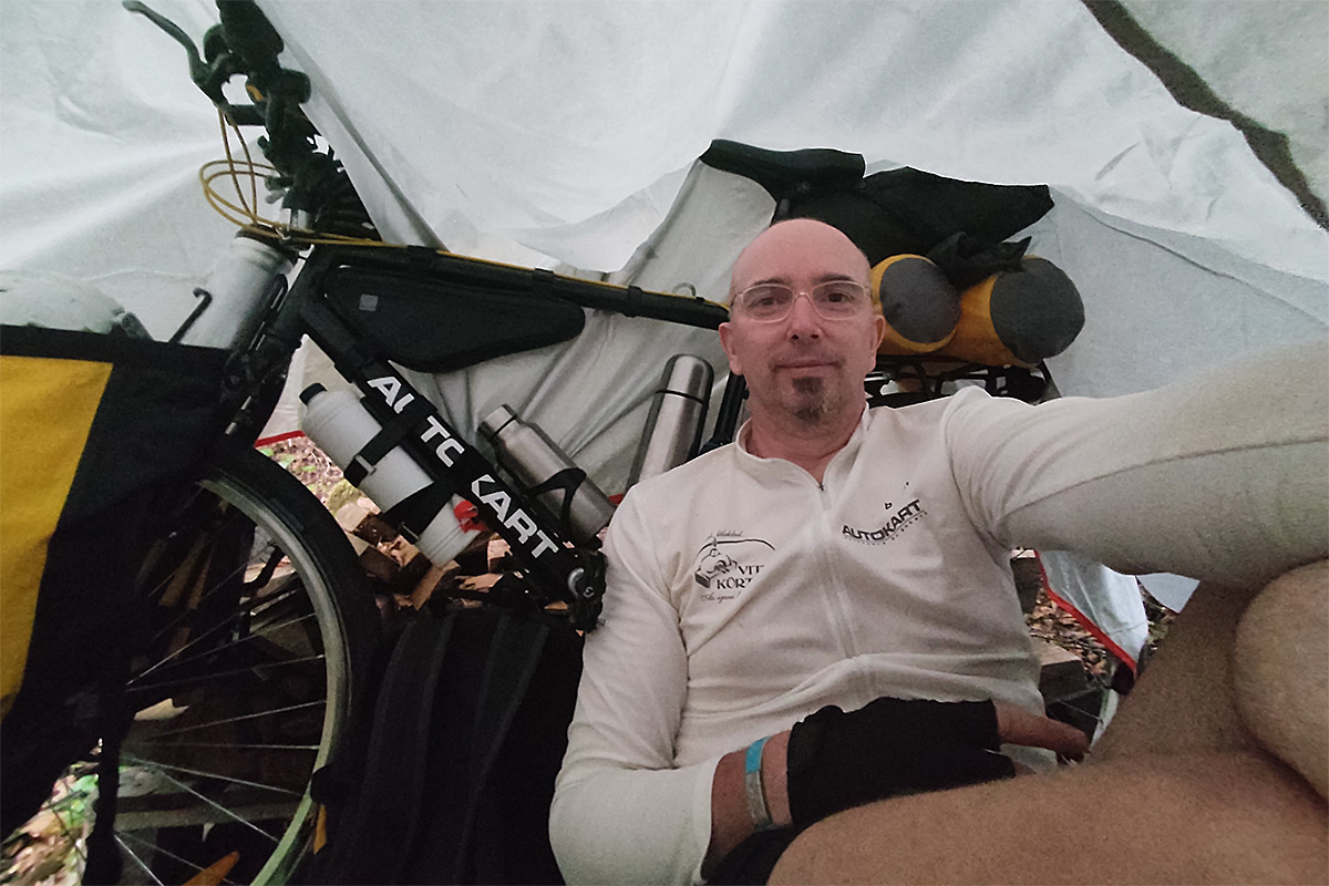 A sátorhely nem volt ideális, csupasz föld apró kavicsokkal, ennek meg is lett később az eredménye. Volt egy korlát, annak támasztottam a bringát, és ráterítettem a ponyvát, hogy száradjon. Megejtettem a zuhanyzást. Mosásnak nem lett volna értelme, esélytelennek láttam, hogy reggelig bármennyit száradjon. Az előző kempingben kimostam a tegnapi ruháimat, de azok sem száradtak meg, nedvesen várják a jobb időt egy zacskóban. A dolog persze így kezd izgalmas lenni, hiszen legfeljebb három napra való tiszta ruhám van, a harmadik rend ráadásul inkább amolyan vésztartalék, városi ruha, nem bringás.