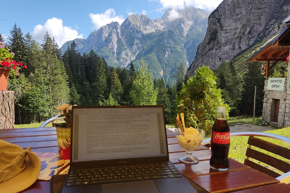 Még viszonylag az elején elmentem egy vendéglő mellett, ott még túl korai volt megállni. De az 1226 méteren lévő Koča na Gozdu-nál már letámasztottam a bringát, mert a kilátás is csodálatos volt. Persze nem hagyhattam ki az kihelyezett iroda fotót, úgy hogy a laptop is előkerült, itt pötyögtem ezeket a sorokat sztracsatella fagyi és kóla mellett. De már megyek is, a java még hátra van.