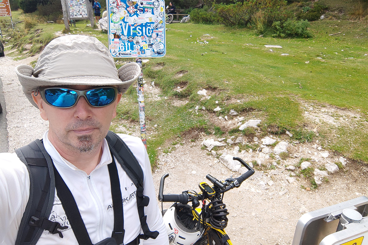 A hágó teteje tömve volt autókkal és emberekkel. Elkészítettem a „kötelező” fotót a táblánál, meg még párat. Egy bringás srác is érkezett, ő is megkért hogy fotózzam le. Ljubljanából indult reggel egy országúti kerékpárral, feltekert a hágóra, és fordult is vissza Ljubljanába. Az is szép teljesítmény, nem mondom.