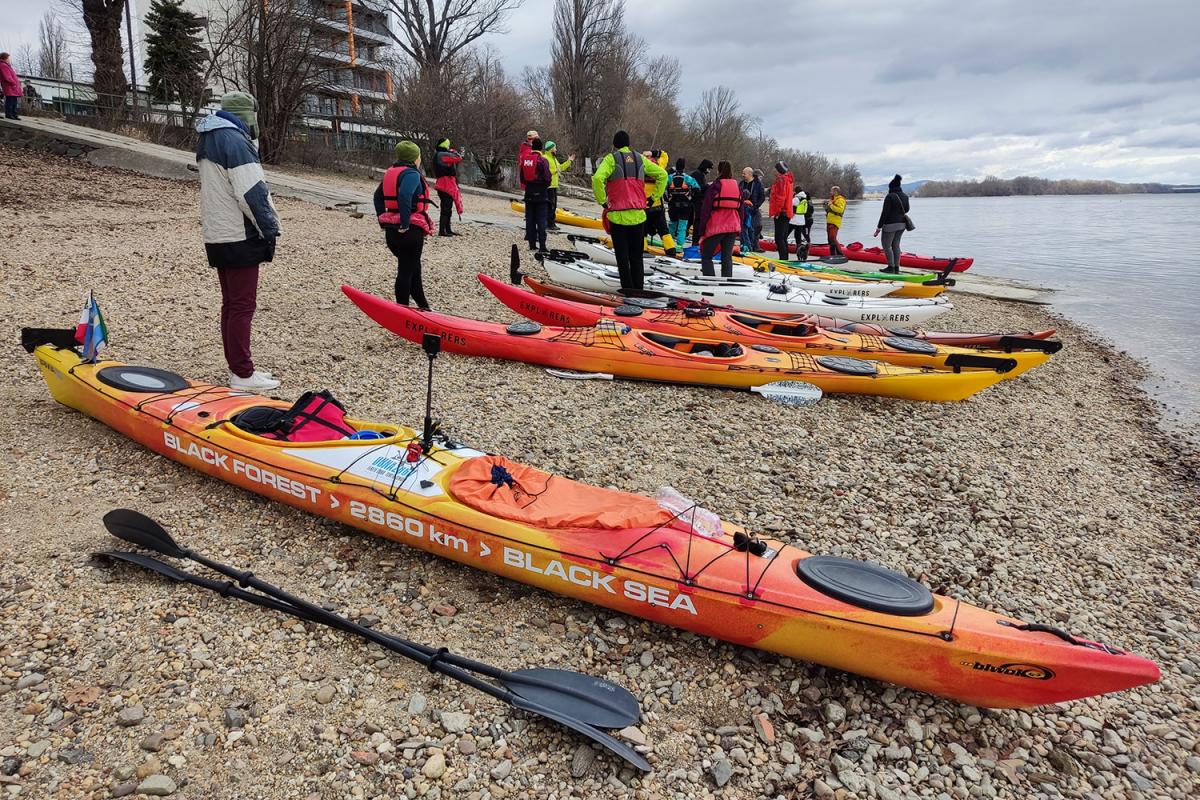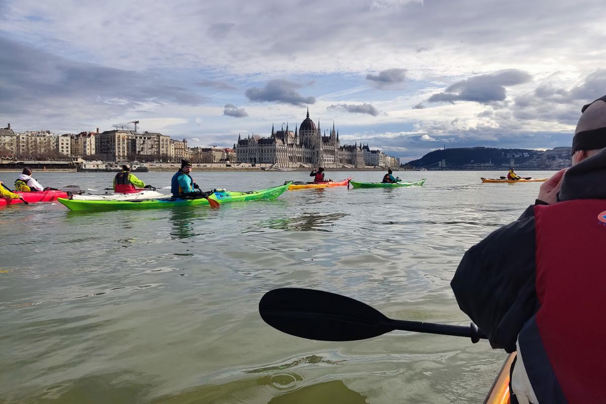 Tizenegy órára vártuk Gábort, de az első éjszakája kalandos volt, erős széllel kellett küzdenie hosszú órákon keresztül, ami ráadásul egyszer bele is borította a Dunába, úgy hogy végül fél egy körül tűnt fel a három kajak a horizonton. Rakonczay egy rövid szünetet tartott, miközben az összegyűlt kajakosok vízre szálltak, majd közösen nekivágtunk a 15 kilométeres távnak.