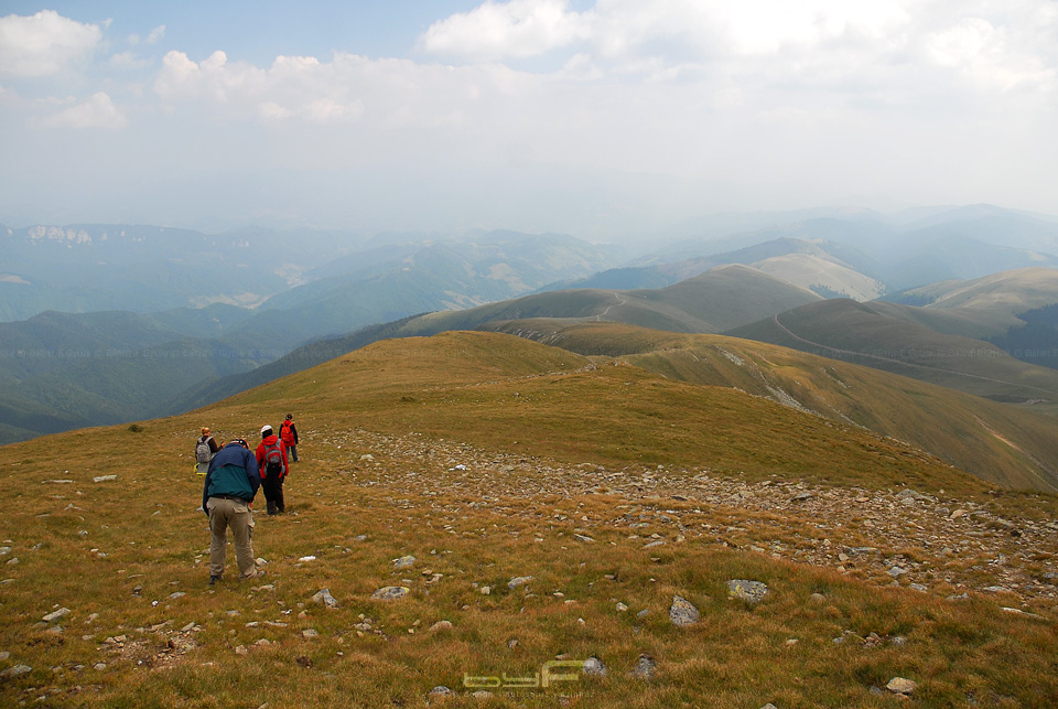 A gerincen balra fordultunk, és tovább haladtunk felfelé. Reméltük, hogy hamarosan felérünk a Păpușára, de amikor felértünk egy lentről csúcsnak látszó pontra, mindig újabb emelkedő jelent meg mögötte. Az ösvény végig füvön halad, itt már nem volt vészes az emelkedő, de még több, mint egy kilométert kellett mennünk, amíg valóban megérkeztünk a zászlóval jelölt, 2391 méter magas csúcsra.