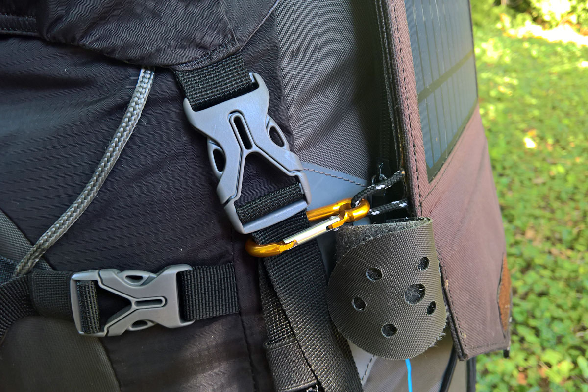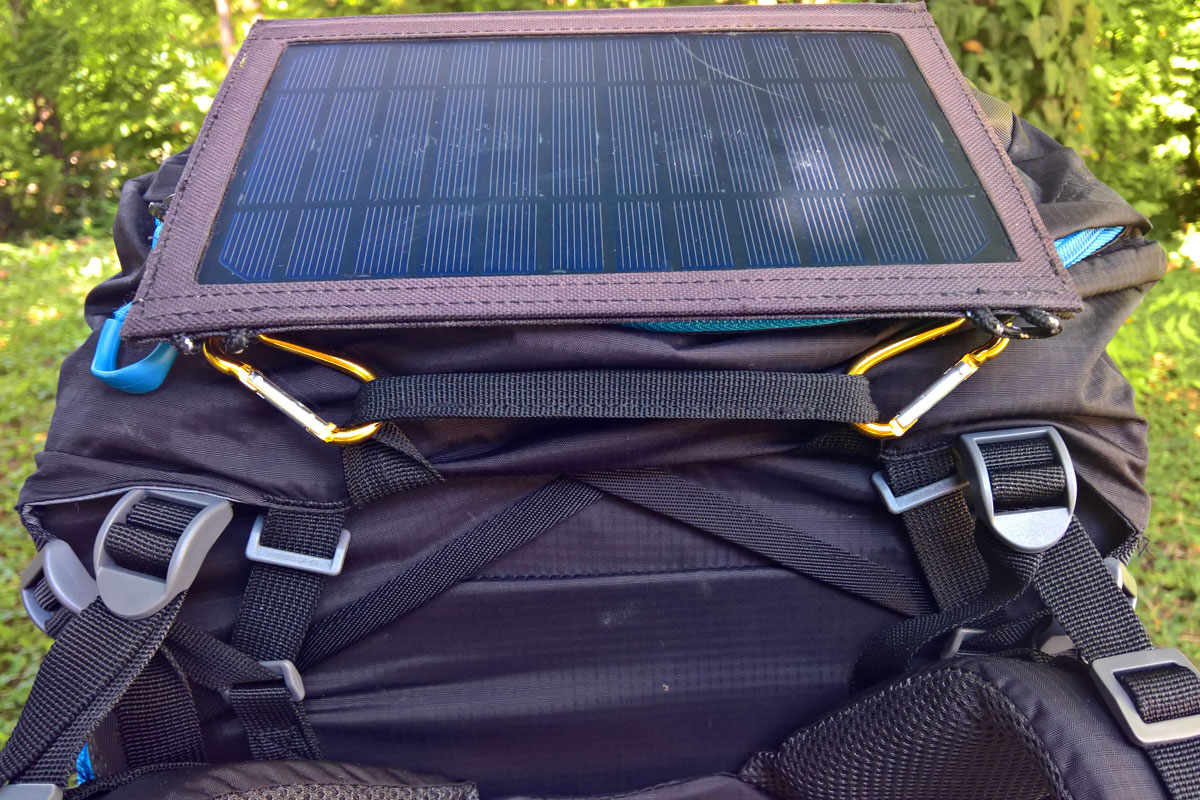 A napelem a hátizsákom tetején volt rögzítve. A három tábla közül a középső nagyjából felfelé, az egyik a fejem felé úgy 45 fokos szögben, a másik pedig hátrafelé néz, majdnem függőlegesen állva. Könnyen belátható, hogy ebben a helyzetben soha nem fog tudni 100%-ot, azaz 10W-ot teljesíteni, viszont bármelyik irányból süt a nap, valamelyik táblát biztosan éri. Éppen ezért, amikor megálltam pihenni, pecsételni, az első dolgom az volt, hogy a napelemet kiterítsem a napra.