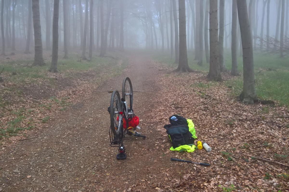 A kék csík mentén ereszkedtem befelé. Az ösvény itt elég rázós, köves. Az erdőben is sűrű köd honolt. Lejjebb néhol kiszélesedett, elsimult az út. Épp egy ilyen szakaszon haladtam tempósan lefelé, amikor egy hatalmas csattanás kíséretében elszökött a levegő a hátsó kerekemből.