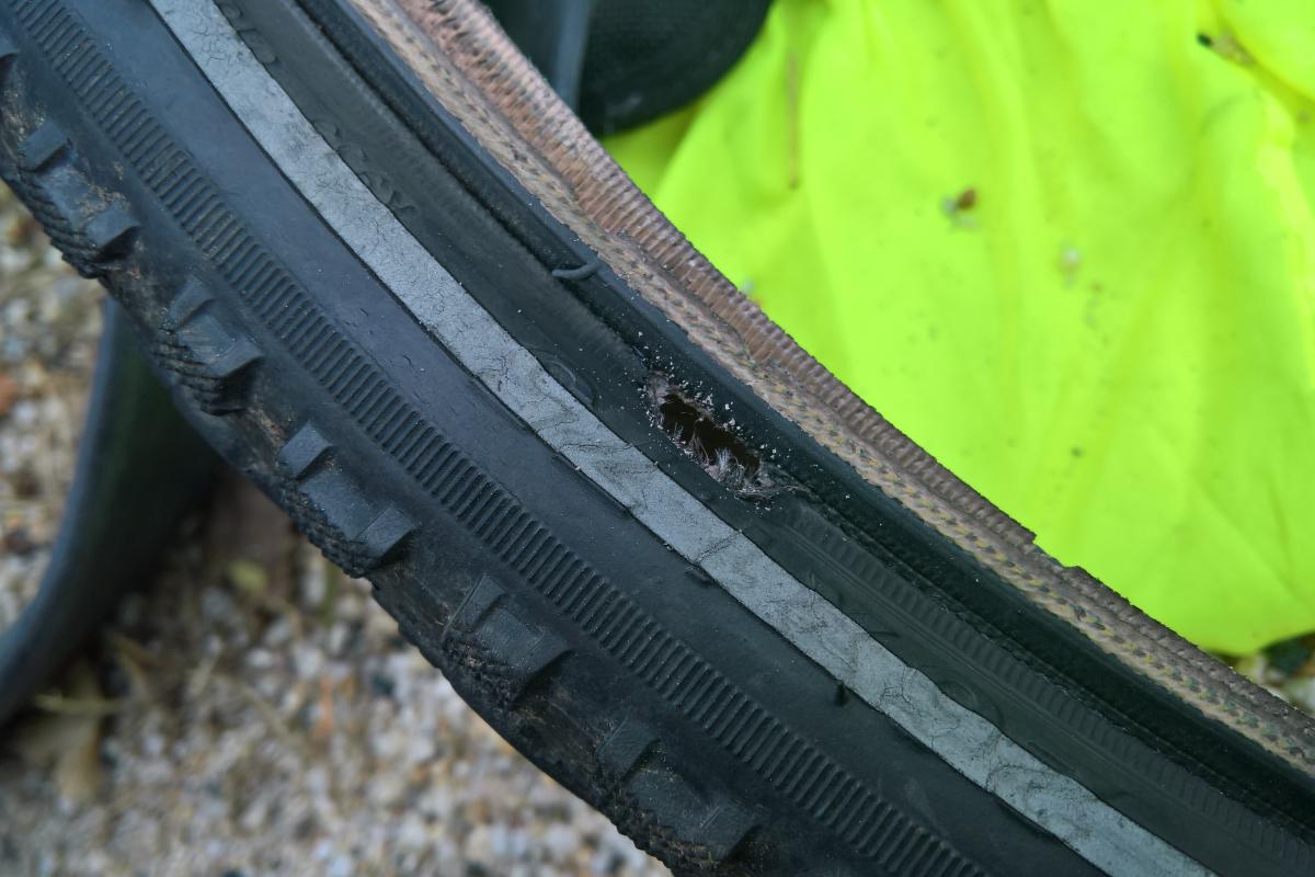A szereléshez a táskákat le kell venni, szerencsére elég gyorsan megy. Kiszedtem a belsőt, végogtapogattam a külső belsejét tüske után kutatva, de nem találtam semmit. A belsőt jobban megvizsgálva vettem észre, hogy az egyik folt engedett el, és alatta egy félcentis hasadás van. Ez sajnos kuka, betettem a tartalék új belsőt, majd összeszedtem a cuccaimat, és tovább mentem.