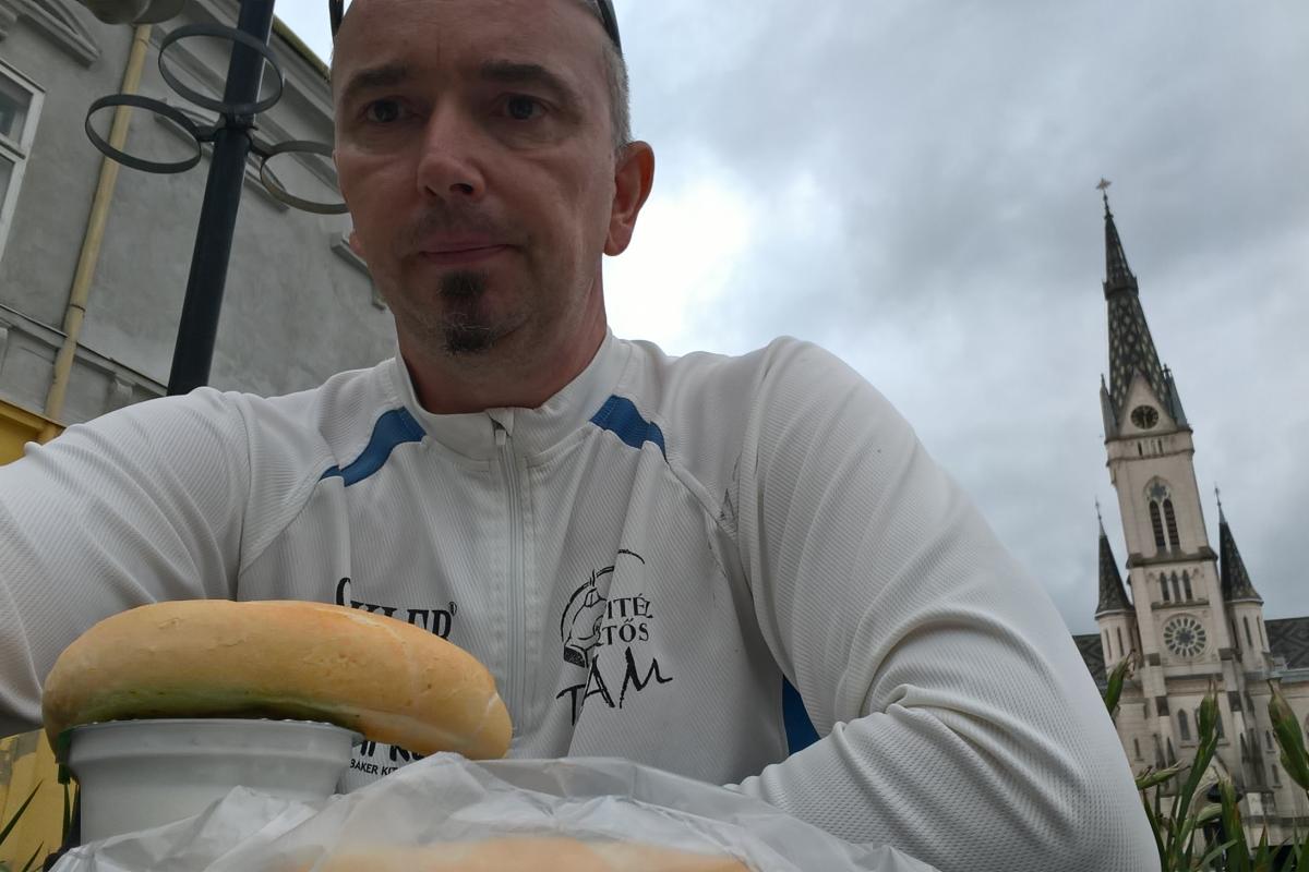 A kerékpár bolt a Velemi úton, egy házban van. Vennem kellett egy új külsőt, két belsőt, egy folt készletet, mert az enyémből elég sok ragasztó ráment a külső foltozására. És természetesen egy pumpát. Az udvaron kicseréltem a külsőt. A megfoltozott belsőt tettem vissza, amit a boltos nem tartott, jó ötletnek, főleg, amikor megkértem, hogy kompresszorral nyomja fel 4 atmoszférára. Azt mondta, hogy pont a nagyon terhelés miatt, hátul ajánlott mindig új belsőt tenni. A bolt délben bezárt, én befejeztem a szerelést, és tovább indultam. Már korgott a gyomrom, úgy hogy a főtéren lévő tejivóban vettem egy kaukázusi kefirt, a mellette lévő pékségben két kiflit, és a padon elfogyasztottam.