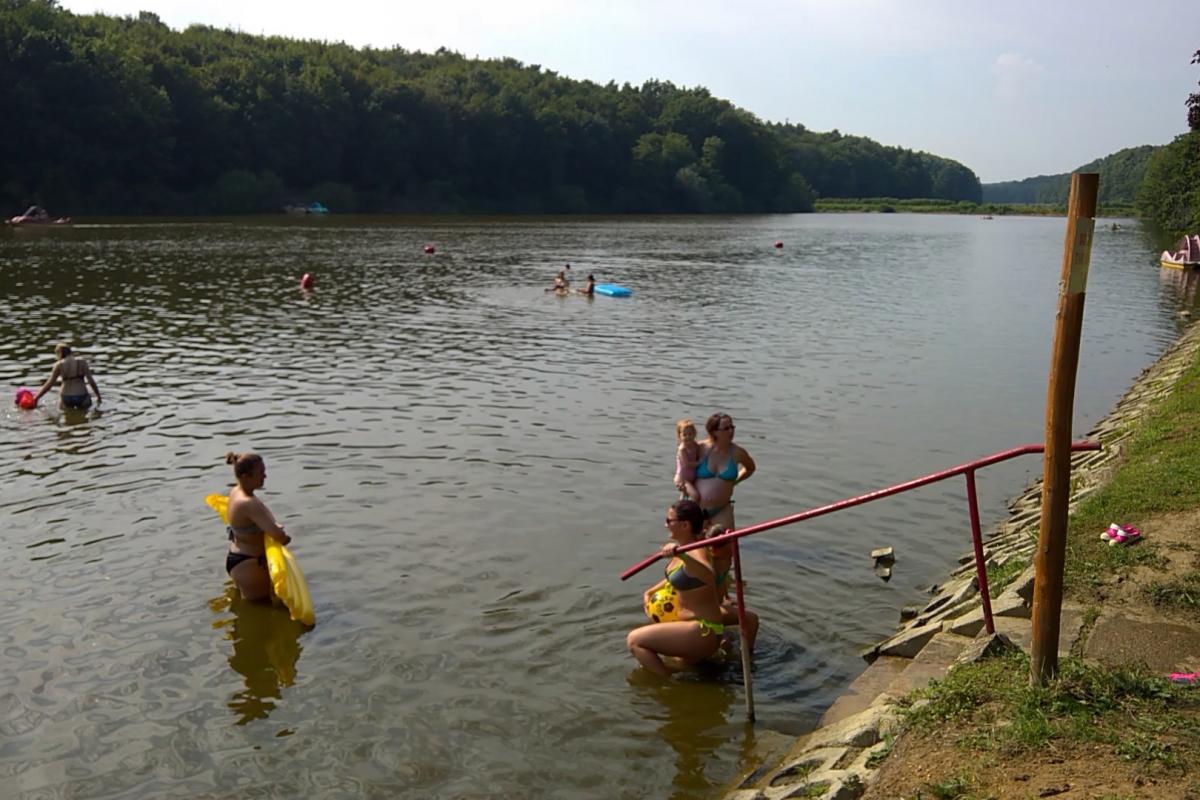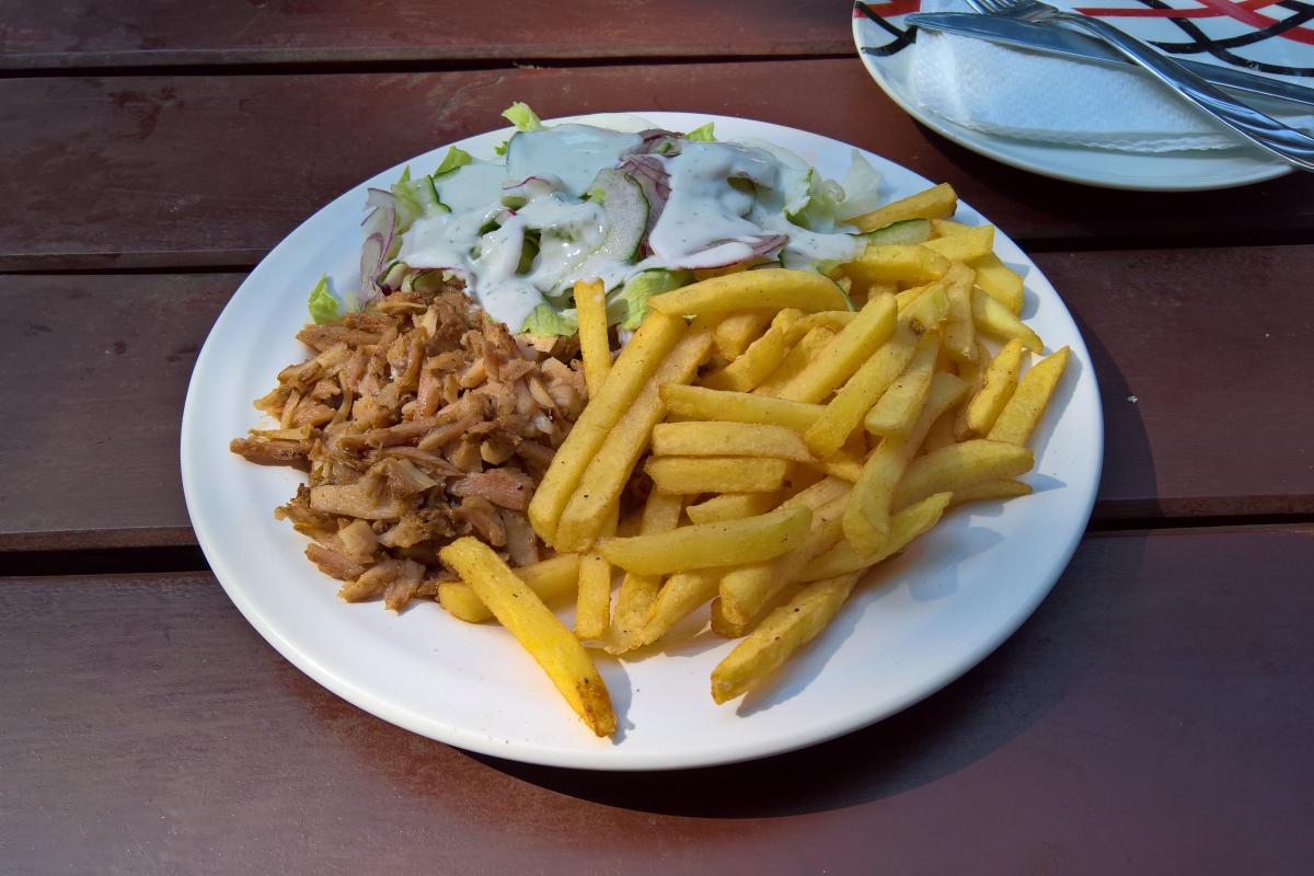 Hosszúperesztegtől a Szajki-tavakig kb fél óra lehetett az út. A strandon befizettem az 500 Ft napi jegy árát, letoltam a biciklit a partra, és bringás nadrággal belecsobbantam a vízbe. Nagyon jól esett, annak ellenére, hogy a víz elég meleg volt, 27 fokot írt a táblán. Miután kifürödtem magam, felmentem a büféhez, és rendeltem egy gyros-tálat.