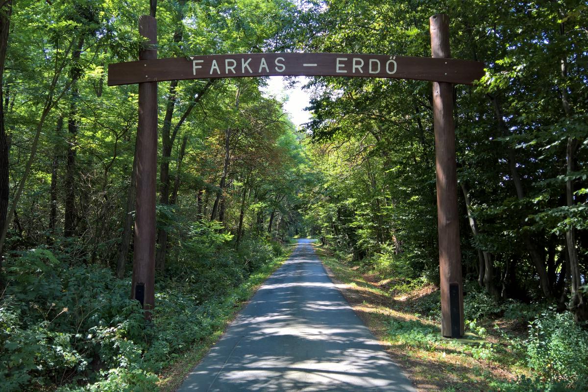 Gércéről a temetők felé vezető meredek utcán keresztül vezetett ki a kék jelzés. Nemsokára átmentem a Farkas-erdőt jelző kapu alatt, ami után egy hosszú, de aszfalt út következett az erdőn keresztül, amely egyben tanösvény is. Itt láttam egy túrázó családot, apuka, anyuka és három kislány, úgy 6-10 év közöttiek lehettek.