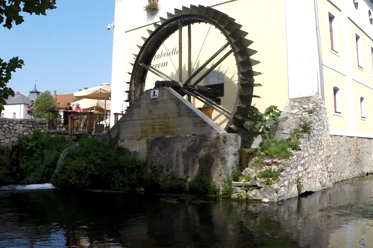 Lesenceistvándra beérve a sarki kocsmába mentem be valami frissítőért. Csak Pepsi termékeik voltak, úgy hogy egy Canada Dry-ra esett a választásom. Innen Lesencetomaj végébe vezetett a kék jelzés, ahonnan a főuton ment be Tapolcára, aminek mint bringás örvendtem, de a gyalogosoknak ez megint egy kellemetlen szakasz. Tapolcán az állomás felé vezetett a jelzés, aztán majdnem kimentem a városból, de észbe kaptam, és visszakanyarodtam a központ felé. Megettem volna egy gyros-t, találtam is egyet a Malom-tó felé tartva. Épp elfogyott a krumplijuk, az eladólány pedig elfutott bevásárolni. Nem bántam, legalább addig is telt a telefonom.