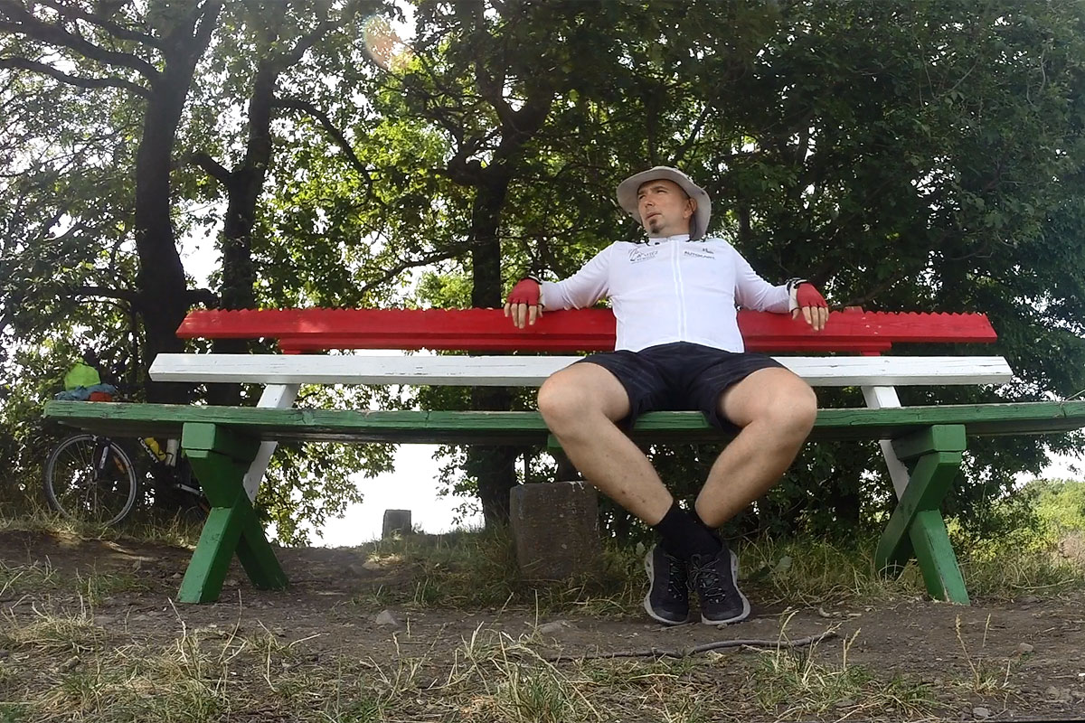 A bácsitól az ösvényen felfelé haladva nemsokára kiértem egy dombtetőre, ahol egy piros-fehér-zöld pad feküdt a földön. Lábra állítottam, pihentem egy kicsit, aztán visszafektettem, mert gyanítottam, azért volt lefektetve, hogy ne törjön össze, ha a szél felborítaná.