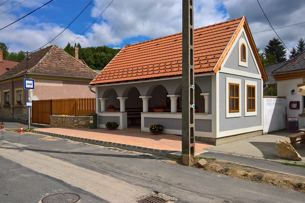 A buszmegállóban lévő közért fedett előterében padok-asztalok voltak, ide leültem megenni a maradék hamburgeremet. A szemközti oldalon házszerű épületben várhatják a buszt a Zirc vagy Veszprém felé tartók.