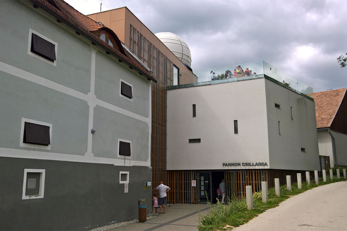 A faluban járdát építenek, a monostor környékén ezért mindenféle kordonok vannak. Az egyik utcácskában elég nagy volt a forgalom, betekertem és a Pannon Csillagda épületét fedeztem fel. A létesítmény honlapja szerint ez Magyarország első számú, komplex csillagászati ismeretterjesztő centruma.