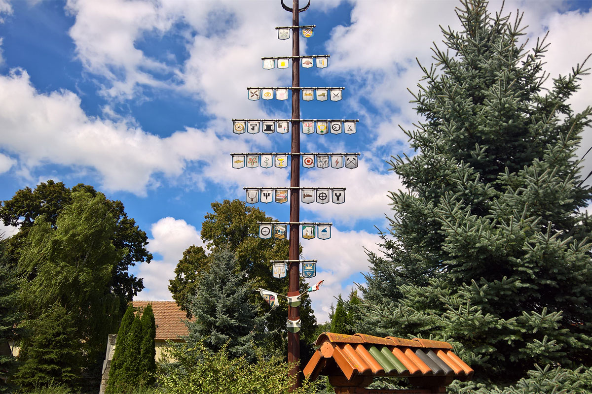 A parkot elhagyva az út átvitt a vasút alatt, majd egy rövid, meredek emelkedő után jobbra visszafordulva indultam a község felé. Városlődön találkoztam először mesterség fával. A magas oszlopon keresztlécek vannak, ezen zászlószerű, de fém lemezek libegnek, amelyekre különböző mesterségek jelei (?) lettek felfestve. Sajnos a kihelyezett információs táblát az olvashatatlanságik kifakította a nap, úgy hogy nem is tudtam meg többet erről az építményről, sem arról, hogy milyen, és miért pont azok a mesterségek vannak feltüntetve rajta.