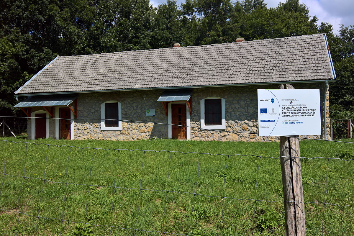 Elhaladtam pár mezőgazdasági gép mellett, majd az erdő szélén megláttam egy épületet. Drótkerítés vette körül, az udvaron padok, tűzrakó hely, és egy építészetileg érdekes különálló kis (gondolom) WC-fürdő épület. A kerítésen táblán köszönik meg a Magyar Állam és Európai Unió támogatását, a 212,66 millió forintot, amit az Országos Kékkör közép-dunántúli Bük régiót érintő túraútvonalának és attrakcióinak fejlesztésére adtak. Az persze nem derül itt ki, hogy ezt a jelentős összeget erre az egy objektumra költötték-e, vagy más fejlesztések is kijöttek belőle, ami viszont nekem leginkább furcsa volt, az az, hogy a kéktúra útvonala a házól egyenesen elindulva egy kilométerre, jobbra, amerre én is folytattam az utamat, 1,2 kilométerre halad el, tehát az objektumról jelenleg nem igazán mondható el, hogy az Országos Kékkörön lenne. Persze valószínűleg hagytak annyi tartalékot a támogatásból, hogy szükség esetén ezen a 2,2 kilométeres szakaszon felfessék a kék csíkokat a fákra.