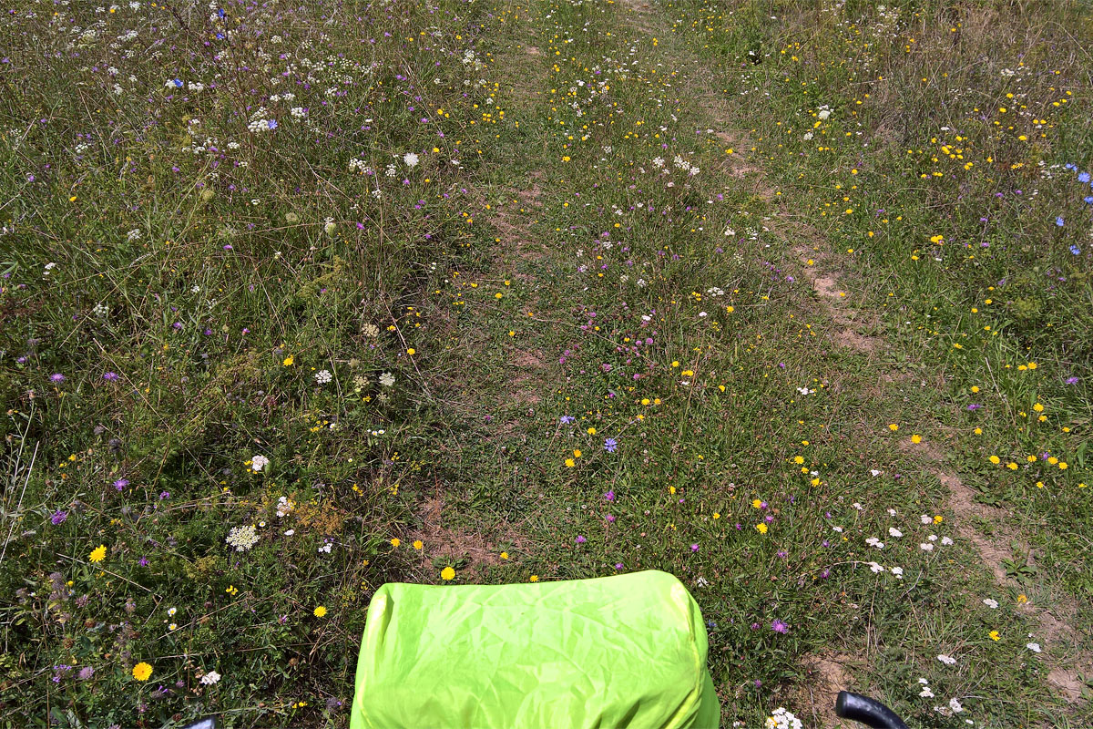 Az erdőből kijőve, egy rövid füves szakasz következett, majd felértem az útra, amely itt már földút volt, zúzottkővel megszórva. Egy középkorú házaspár téblábolt ott, kérdezték nem tudom-e merre kell menni a Hungarocontrol felé. Mondtam, hogy vagy körbe z úton, vagy ahol én jöttem, a kék jelzésen, majd jobbra. Kissé elszomorodtak, mert a kéken indultak, de egy idő után visszafordultak, gondolván, hogy rossz felé mennek. Most újra elindultak arra.