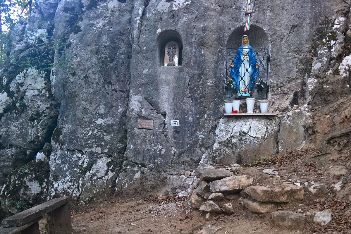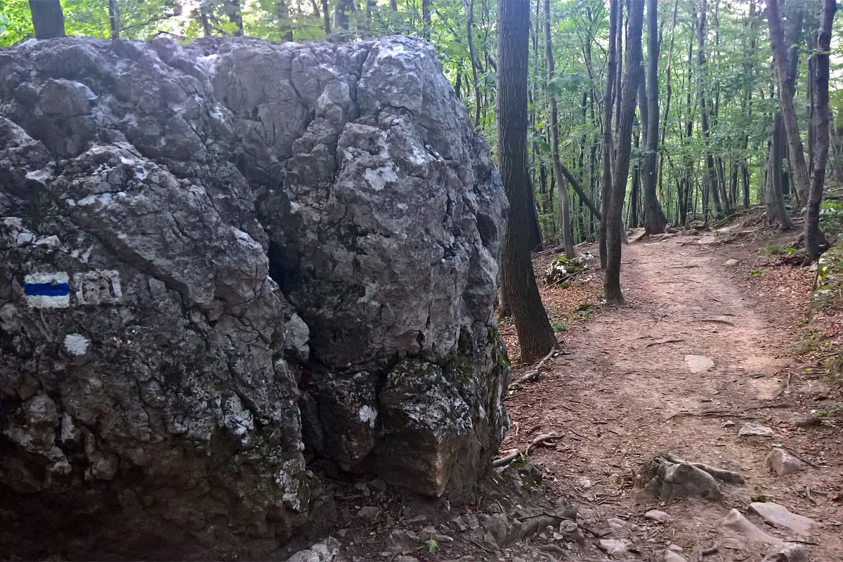 A Serédi kastélyig egészen jól biciklizhető az út, minimális szintkülönbségekkel. A kék jelzés ezt követően egy keskenyebb ösvényen folytatódott. Gondolkodtam, hogy merjek-e arra menni, de mivel a Pusztamaróti turistaház csak mintegy másfél kilométerre volt, arra gondoltam, hogy sötétedésig tolva is eljutok odáig. Kellett is tolnom, egy sziklás szakasz következett, amin lehetetlen volt biciklizni. De nem volt hosszú, utána megint fel tudtam ülni, és nemsokára megérkeztem a pusztamaróti emlékhelyhez.