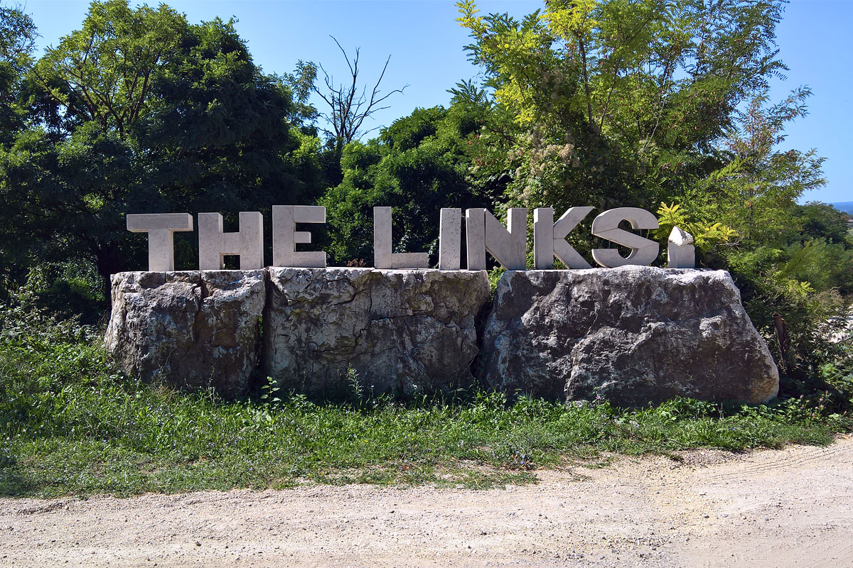 Tovább haladva egy tájidegen feliraton akadt meg a szemem. Egy kő alapon az angol THE LINKS felirat szerepelt. El nem tudtam képzelni, mi lehet ez, és nem volt ötlete annak a bringás férfinak sem, aki itt utolért. Itthon utánanéztem, a www.thelinks.hu honlap szerint ide egy Kelet-Európában egyedülálló golfpályát, klubházat, hotelt terveztek építeni 2006-ban. Aztán az egészből nem lett semmi.