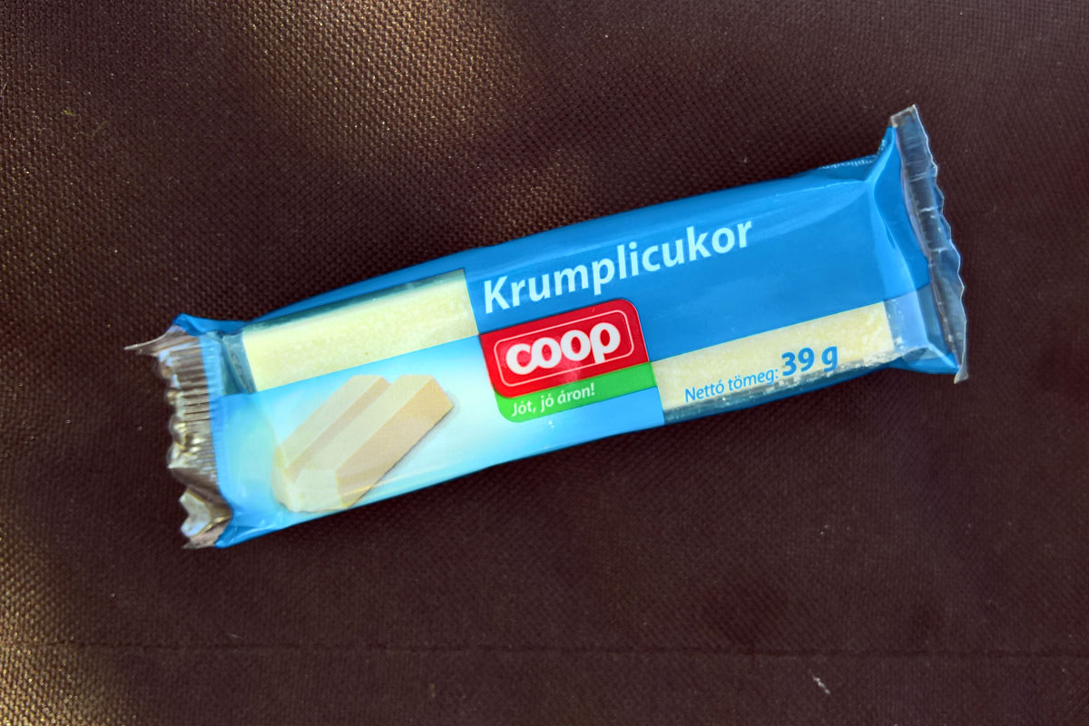 Mivel továbbra sem találtam sehol gázpalackot (itt Putnokon is érdeklődtem egy autós boltban, de amit javasoltak, hogy nézzem meg, az zárva volt), csak hideg ételt vettem, a maradék gázt a reggeli meleg teákra tartogatom. Meglepetésemre találtam Coop-os krumplicukrot. Nem tudtam, hogy Magyarországon is van, eddig nem láttam sehol máshol. Egyébként nagyon finom volt, nem túl kemény, és szétolvad a szájban. Később jó szolgálatot tett a Bükkben és a Mátrában a hosszú kaptatókon.