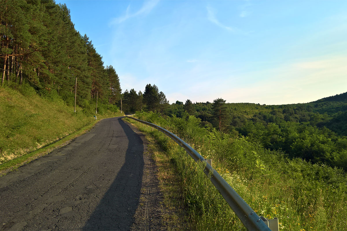 A sráccal váltottunk pár szót. Ma Putnokról jött, érdeklődésemre elmondta, hogy innen mehetek a jelzésen, nem lesznek nagyobb akadályok. Mondtam, hogy sátorhelyet keresek Putnok után, a Lázbérci-tavat javasolta. Megköszöntem, elváltunk. Innen a kék jelzésen tekertem tovább a faluban. A falu után maradtam a szerpentinen (a jelzés a bokrok között levágta a kanyarokat), majd nem sokkal később a túraútvonal letért az aszfalt útról a Mohos-tavak felé. Gondolkodtam egy kicsit, aztán én is elindultam arrafelé. Ahogy ilyenkor lenni szokott (erdőben, ösvényen), persze, hogy nem volt sima az utam: