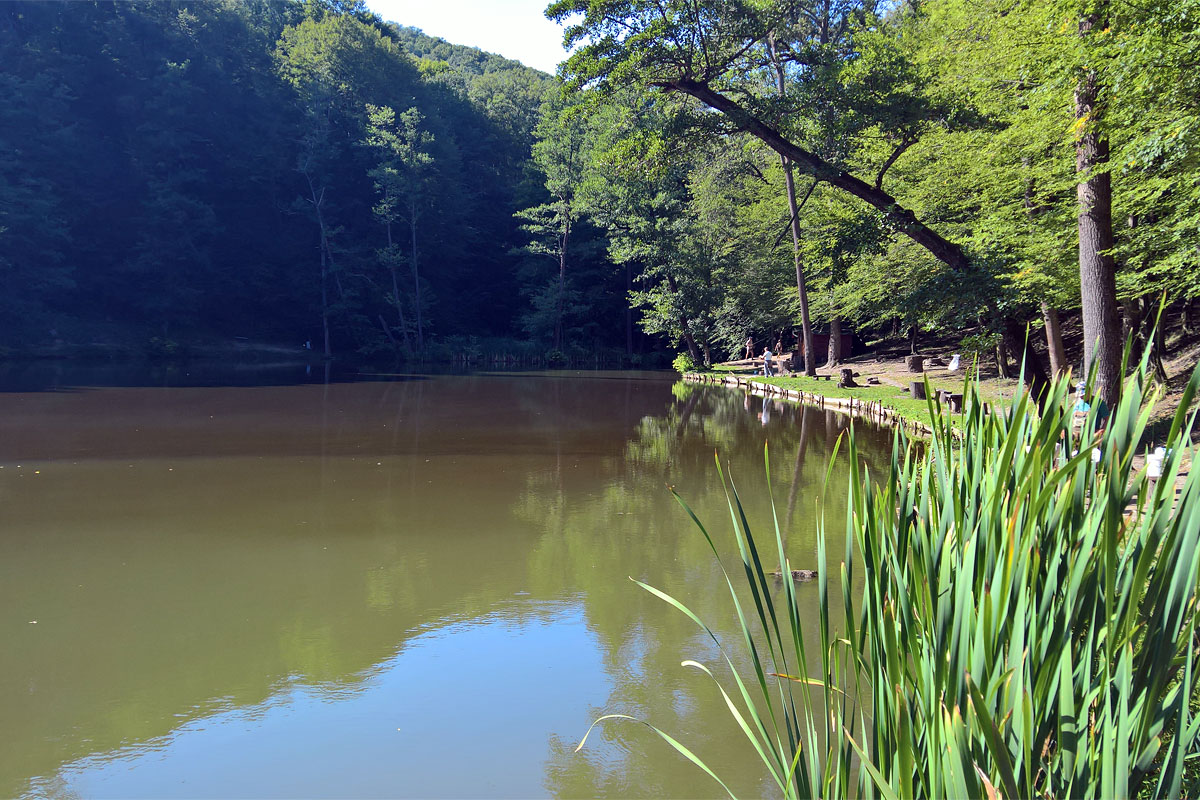 A Mohos-tavakon túlhaladva egy meredek kaptatóval vitt vissza a kék jelzés az útra, annyira meredekre, hogy tolni kellett a biciklit. Az útra visszaérve már csak be kellett gurulni Putnokra, de előtte még készítettem pár fotót a Pálma-tóról, ami, a gátat elnézve, egy mesterségesen létrehozott, egyébként szép halastó az erdőben, az út mellett.