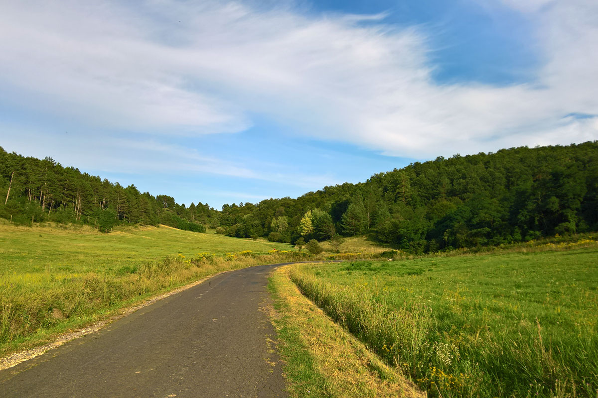 Még korán volt, úgy hogy azt terveztem, meghallgatva a keleméri fiú javaslatát, hogy elmegyek a Lázbérci-víztározóig, és ott táborozok le. Újra dombok közé kanyargott be az út. A kék jelzést valahol elvesztettem, de nem bántam, gondolom megint bement valahol egy erdei ösvényre, ami jó a túrázóknak, nekem kevésbé. Főleg úgy nem, ha még felfelé is megy, mint most.