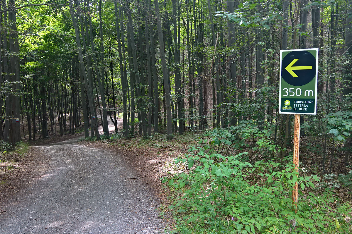 Az OKT útvonala Mályinkából az erdőn keresztül, némiképp rövidebb távon jut el Bánkútra. A sípálya előtt nem sokkal keresztezte az aszfaltutat, itt egy tábla jelezte, hogy arra lesz a Bánkúti sípálya büféje is. Letértem hát aszfaltról, hogy a széles kavicsos úton leguruljak. Persze a legurulás nem tartott sokáig, a sípálya mellé érve újra felfelé kellett haladni, éppen csak fel tudtam tekerni, anélkül, hogy le kelljen szálljak.
