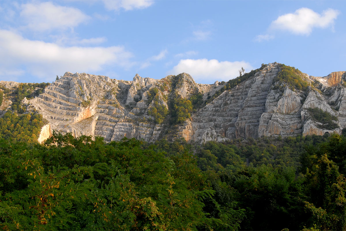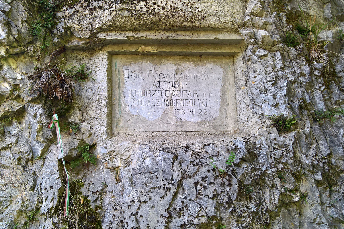 Rövid ideig viszonylag nyílt volt a terep. Több földút és turistaút is keresztezte az utat, egy elhagyott kőépületnél egy túrázó párral is találkoztam. Nem sokkal később az út egy szoroson haladt keresztül, ez az Olasz kapu. Hogy miért így hívják, az a sziklába vésett feliratból derült ki: