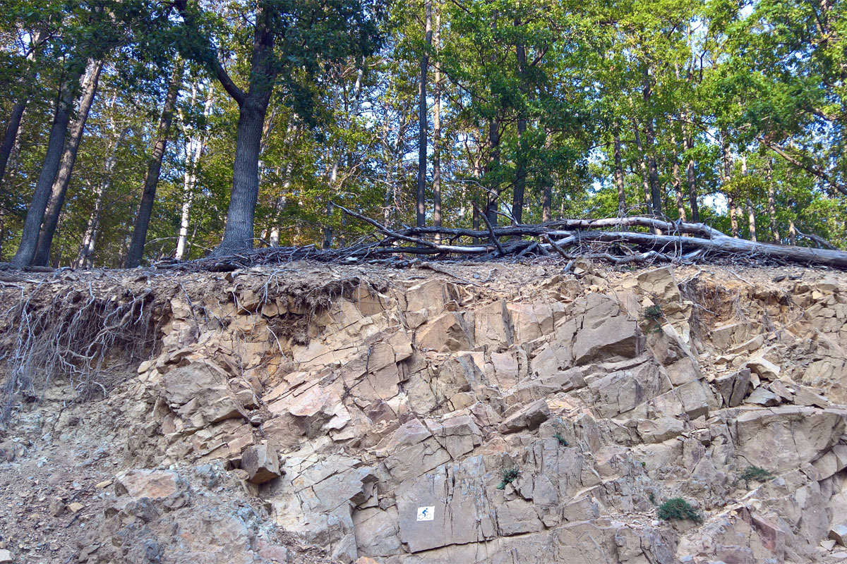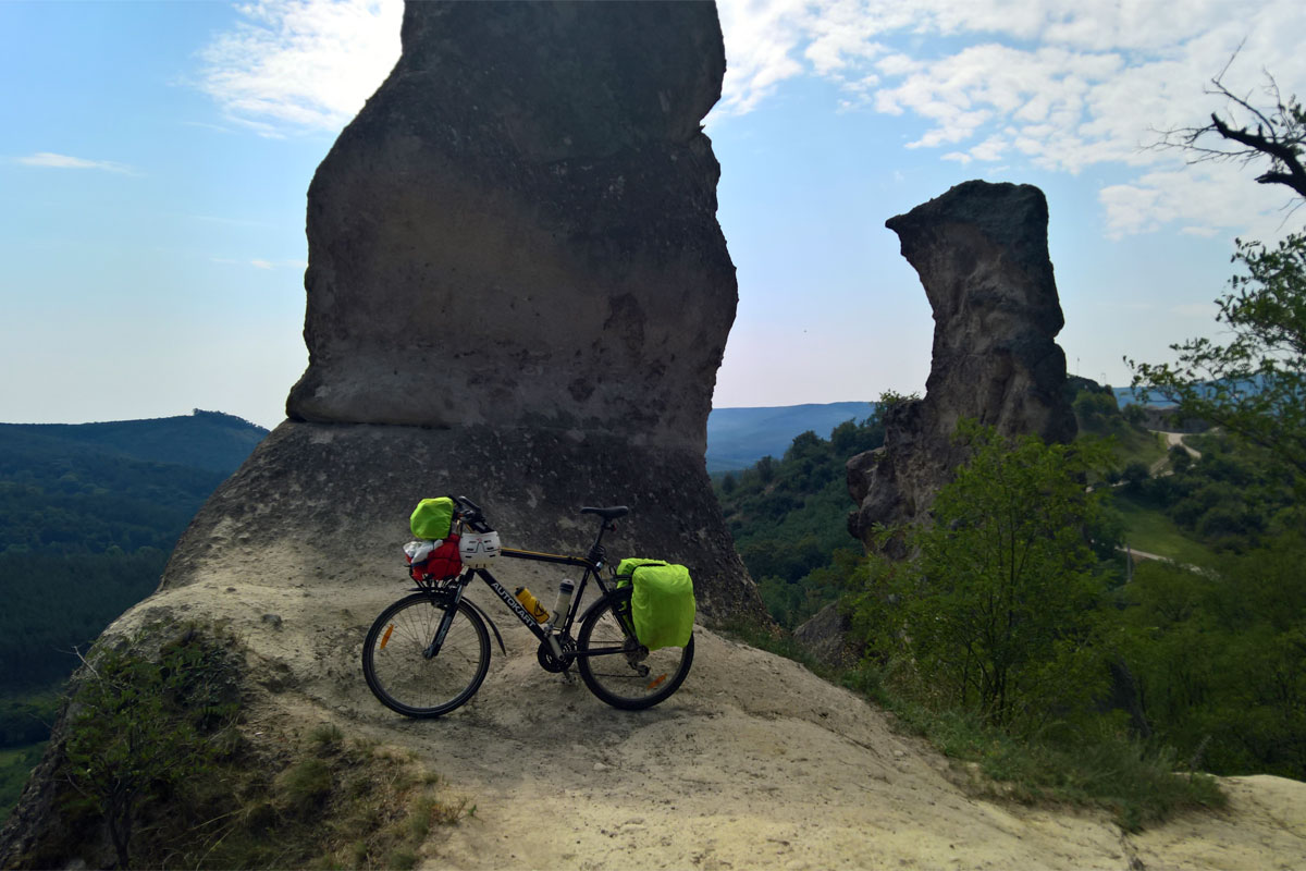 A Kígyó-patak völgyébe érve, a Rozsnak-pihenő közelében egy nagyobb csoport pihent, evett. Megálltam. Sirok felől jöttek, így kölcsönösen tájékoztattuk egyámást, hogy a továbbiakban mire számíthatunk, illetve a biciklin lévő sok csomagot látva kifaggattak utam jellegéről. Ők még maradtak, én továbbindultam. A frissen megszerzett információknak megfelelően egy nagyon meredek szakasz következett az erdőben, tolnom kellett felfelé a bringát az ösvényen. Aztán enyhült az emelkedő, majd ki is lapult a terep. Az erdőben itt-ott fakitermelés nyomai, farakások, és egy fán ottfelejtett sapka egy kék jelzés mellett. Egyre könnyebb volt tekerni, már lefelé haladtam, de még a gerincen. Hamarosan hangok ütötték meg a fülemet, megérkeztem a Barát-sziklához. Kitoltam a biciklit, és készítettem pár fényképet, és közben megjegyeztem magamnak, hogy ez a Szarvaskő-Sirok útvonal egész kellemes volt, bele lehet illeszteni egy egynapos Eger – Szarvaskő – Sirok – Egerbakta – Eger bringakörbe.