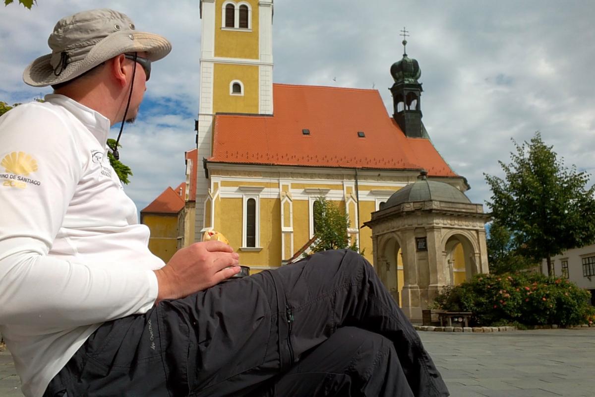 Kőszegre beérve bementem az első közértbe és bevásároltam. Lapkasajtot, ami vaj helyett is használható, szalámit, joghurtot, kiflit, zsemlét, müzli szeletet, csoki, almát. Ezután már csak egy helyet kellett keresnem, ahol megreggelizhetek. A Jurisics Miklós téren találtam padokat. Lehúztam a bakancsot, kitérítettem a még nedves pólókat és a napelemet, és kényelmesen megreggeliztem. Előjöttek az El Caminós emlékek, ahol szintén egy, egy-egy település terén fogyasztottuk el reggelinket Gáspárral.