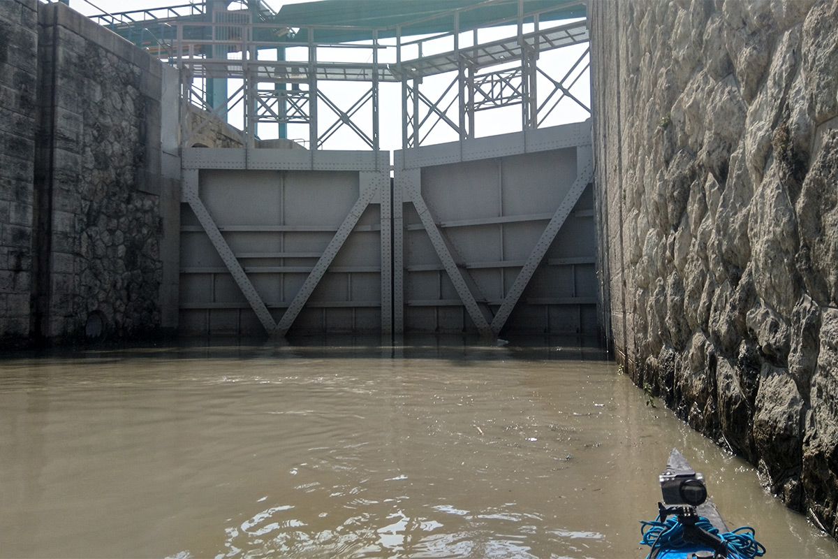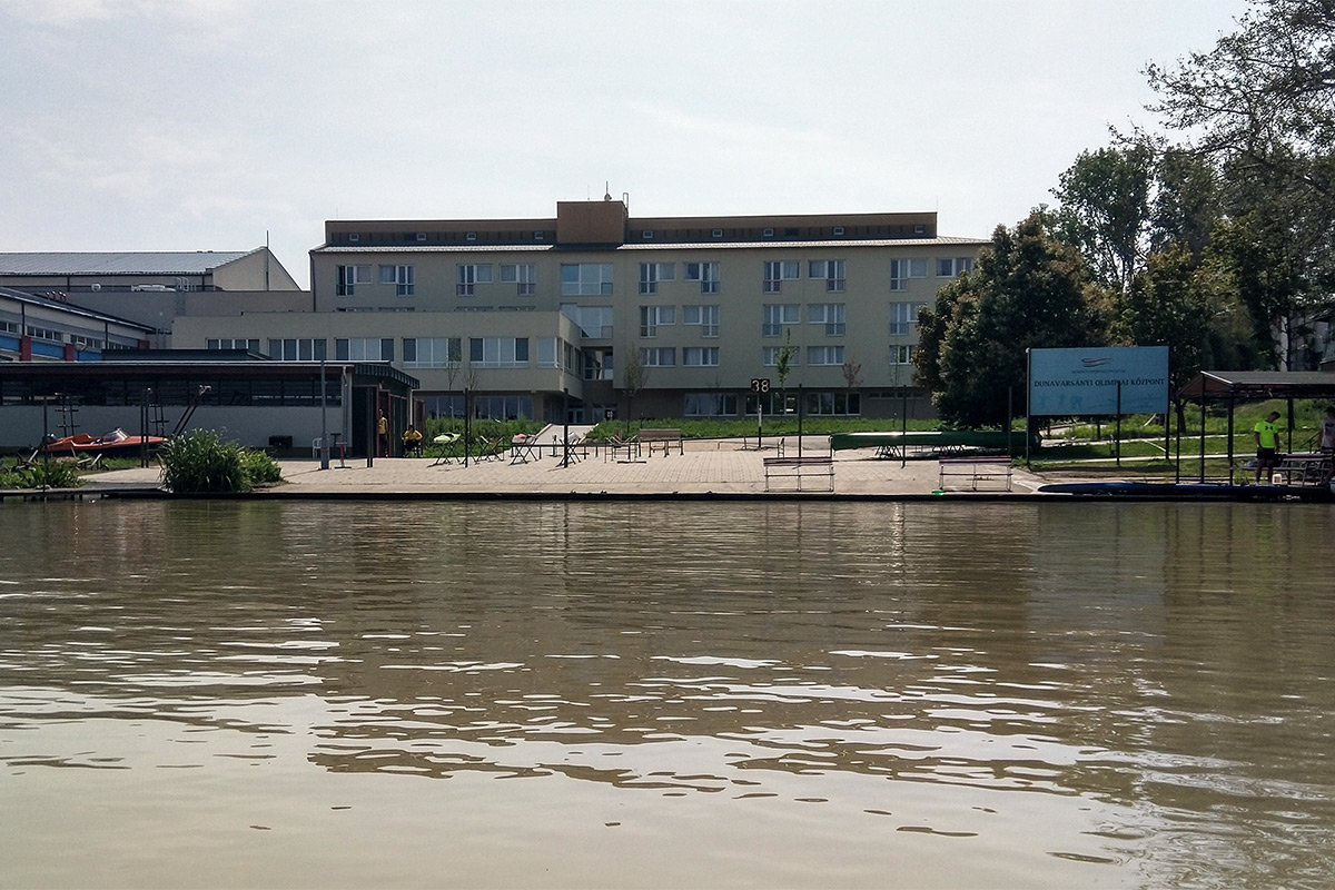 A zsilip előtt egy marinára számítottam, de egy építkezés fogadott. Megközelítettem a zsilipet, és jobbra, egy stégen étkező pártól kérdeztem meg, hogy kiköthetek-e náluk, kiemelés céljából. Itt aztán egy igen kellemetlen meglepetés fogadott, hiszen egyrészt ők is mondták, hogy szerintük az építkezés miatt nem fogom tudni itt átvinni a kajakot zsilip túloldalára, majd kicsit sétálva én is megállapítottam, hogy ez most itt lehetetlen. Ilona korábban átküldte a zsilipkezelő telefonszámát, úgy hogy felhívtam, hátha jobban ismeri a környéket. Előbb azt mondta, hogy az építkezés mellett el tudok menni, de miután mondtam, hogy sajnos nem, a zsilip oldalára terelődött a szó. Volt ott egy lépcső, ki- és bepakolással ott ki tudtam volna emelni, és elvileg a túloldalon hasonlóképpen visszatennem. Valószínűleg érezhetett némi kétségbeesést a hangomban, és mivel természetesen neki is megemlítettem, hogy egy 900 km-es túra végén vagyok, és hatra a Gellért térre kell érnem, felajánlotta, hogy kinyitja a zsilipet, csak ne nagyon reklámozzam. Szóval légyszi’ vegyétek úgy, hogy ezt nem mondtam el nektek ;-)