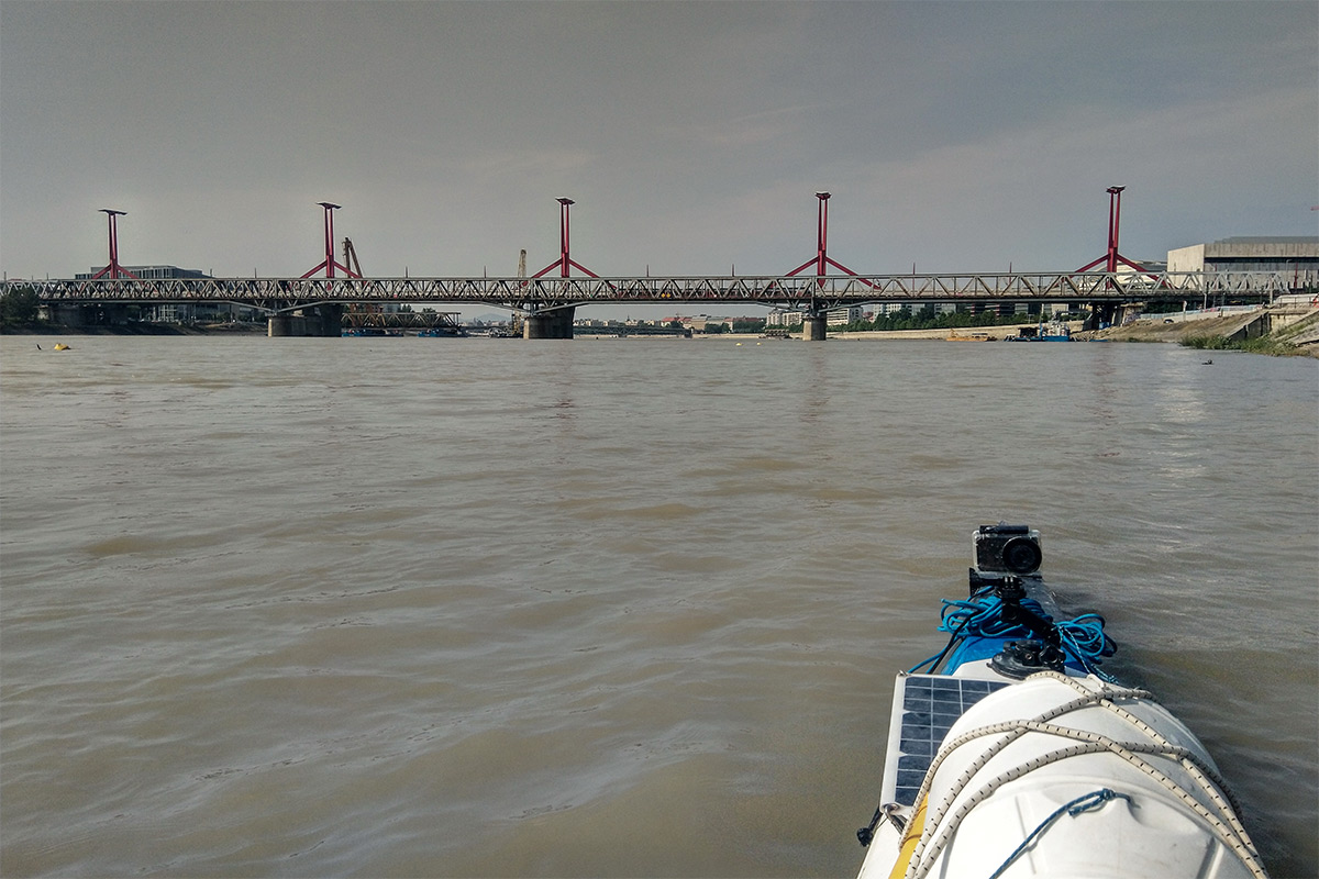 Azt terveztem ugyanis, hogy a Ráckevei-Duna ágból kijövet egyből átevezek a jobb partra, hiszen az a kanyar belső íve, kisebb a sodrás, és a cél is azon az oldalon van. Amiről nem tudtam, hogy építkezés folyik a Lágymányosi-hídnál, így a Clark Ádám úszódarun kívül több hajó és uszály is horgonyzott a mederben és a partok mellett. Ezek miatt a pesti oldalon indultam felfelé. Itt is be kellett menni a sodrásba egyszer, hogy kikerüljek egy kisebb hajót, és uszályt mellette, majd visszatértem a part mellé, ahol már nem volt vészes a sodrás. A Petőfi híd előtt vettem célba a budai oldalt, majd átérve ott folytattam az utamat felfelé. Az A38 mellett a part felől araszoltam el, mert minden drótkötél a víz felett feszült, de a BME Közlekedésmérnöki kar toronyépülete mellett lévő üzemanyagtöltő állomást már kívülről kellett kerülnöm.