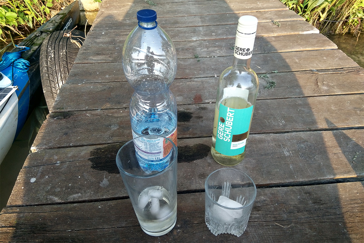 Egy dolgot láttam problémásnak, a random letáborozást. Mivel majdnem végig be van építve a part, esetleg strandok vagy környékük jöhetett volna számításba, esetleg megnézhettem volna, hogy van-e valahol kemping a part mellett. Vagy a már bevált megoldás, megkérdezni a tulajt, hogy éjszakázhatnék-e a stégje mellett a parton. Ez történt szombaton is, jó huszonhárom kilométer evezés után. Hét óra felé járt, és már elkezdtem figyelgetni a partot. Egy stégnél megpillantottam egy tevő-vevő férfit, neki szegeztem a fenti kérdést, természetesen kiegészítve azzal, hogy honnan jövök. A válasz természetesen igen volt, de a kérdés is érkezett, hogy mit szólnék egy kis hideg fröccshöz. Hezitáltam egy keveset, mondván, hogy a hideg szóda vagy ásványvíz is megteszi, de aztán meggondoltam magam, hiszen, ha már megkínált, és magának is töltött Lajos a borból, mégiscsak illik koccintani.