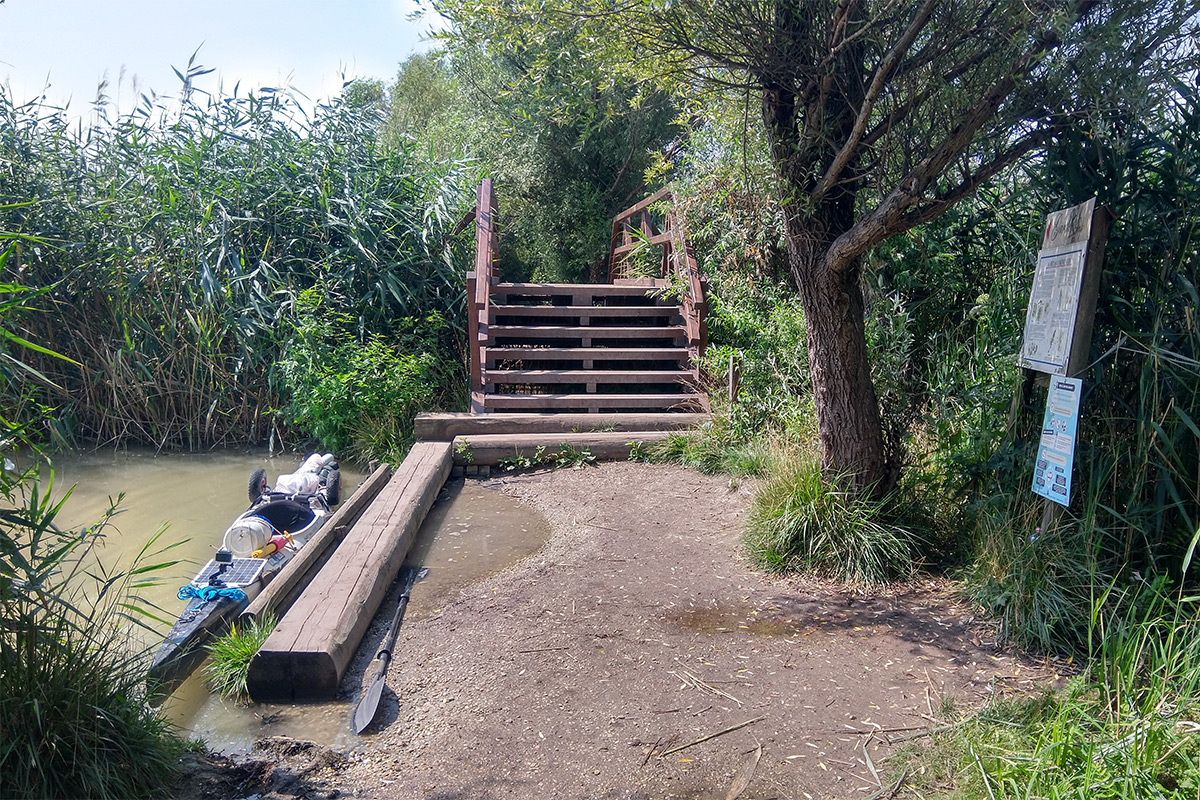 Az első szünetre egy part menti sétányon kötöttem ki. Nem volt tervezett, de volt egy kellően széles rés a nádasban, és láttam a parton lévő mini stég szerűséget, ahol kényelmesen kiszállhattam. Megtöltöttem a palackomat vízzel, letoltam egy doboz kólát, és még a fa mellett is hagytam egy bontatlan palack ásványvizet, mert a délutáni érkezéssel immár felesleges súly volt a kajakban.