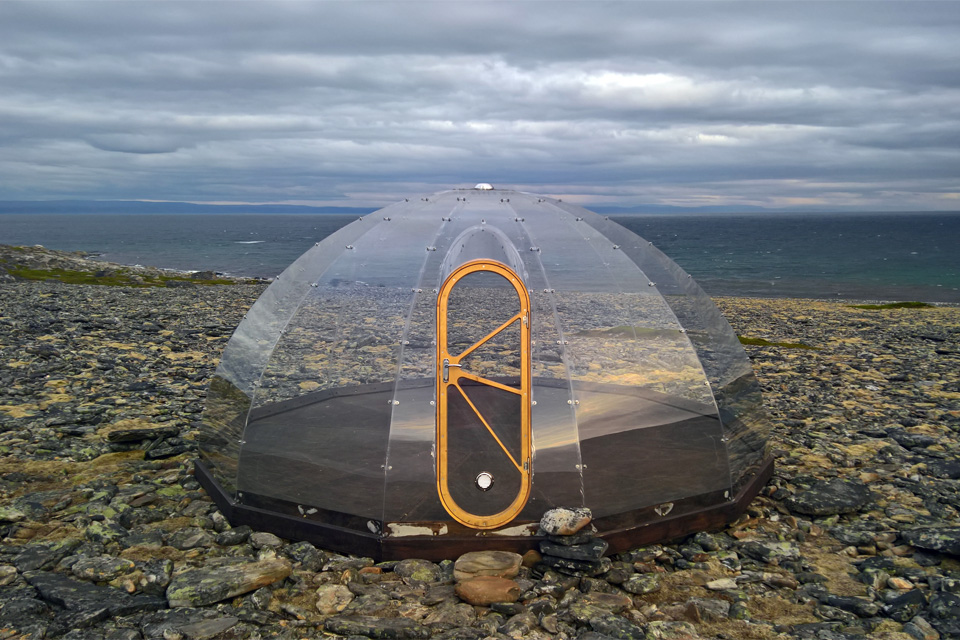 Ideje volt indulni. Jó lett volna az eltérőig, Olderfjordig visszaérni, de már elég késő volt, ezért még előtte néztünk ki egy kempinget, ami nem az úton, hanem attól úgy két kilométernyire volt. Az eltérőhöz érve azonban azt láttuk, hogy a táblán az össze szállást jelölő piktogram át volt húzva, úgy hogy mentünk is tovább. Én el tudtam volna képzelni a vadkempingezést a tengerparton, hiszen gyönyörű a táj, de aztán én is meggondoltam magam, amikor kiszálltunk lefotózni egy ismeretlen funkciójú plexi iglut (amiben egyébként biztos jól lehetne aludni vagy csillagokat és a tengert nézni), hiszen nagyon erősen fújt a szél.