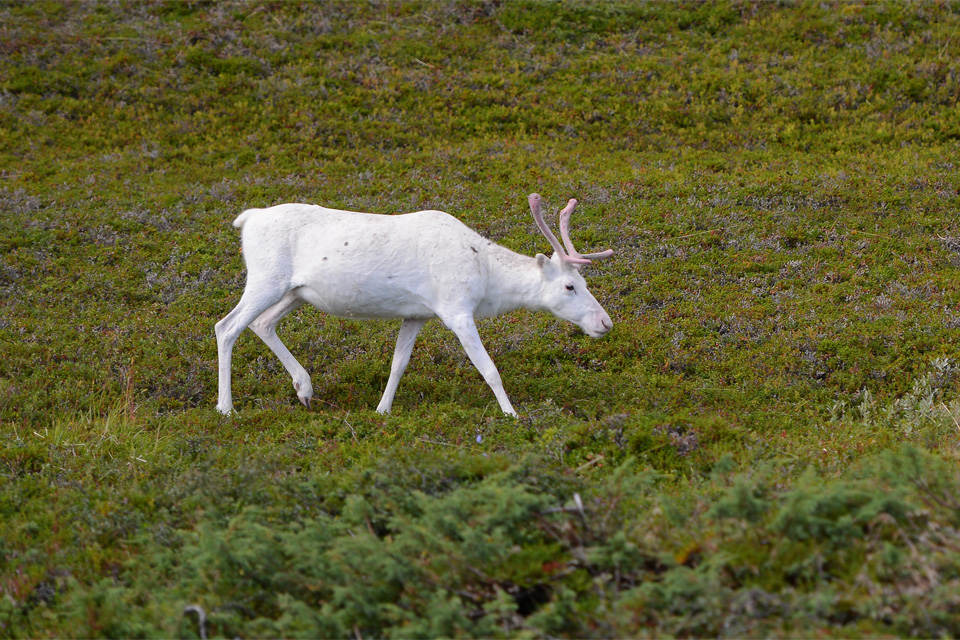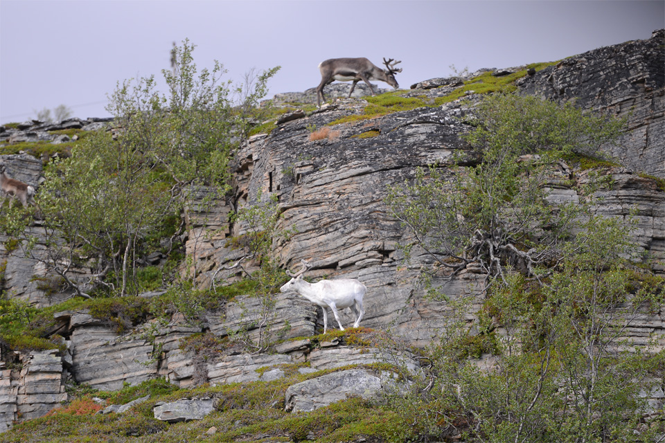 Rénszarvas továbbra is sok van, lassan már csak legyintünk rájuk, annyit láttunk belőlük. Először láttunk viszont fehér rénszarvast, és először láttunk olyant is, hogy a szarvas a zergékhez hasonlóan a meredek sziklafal oldalában legeljen.