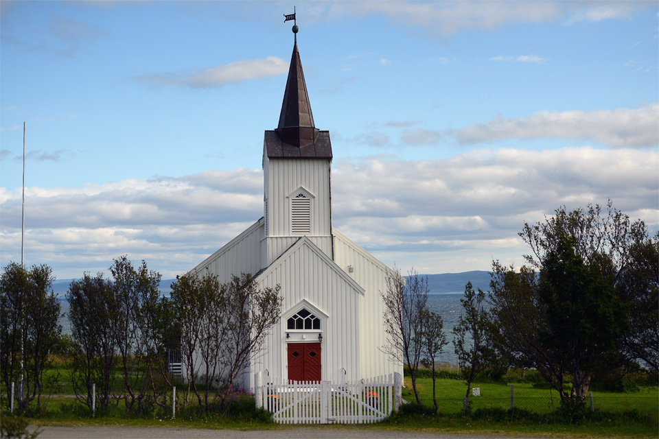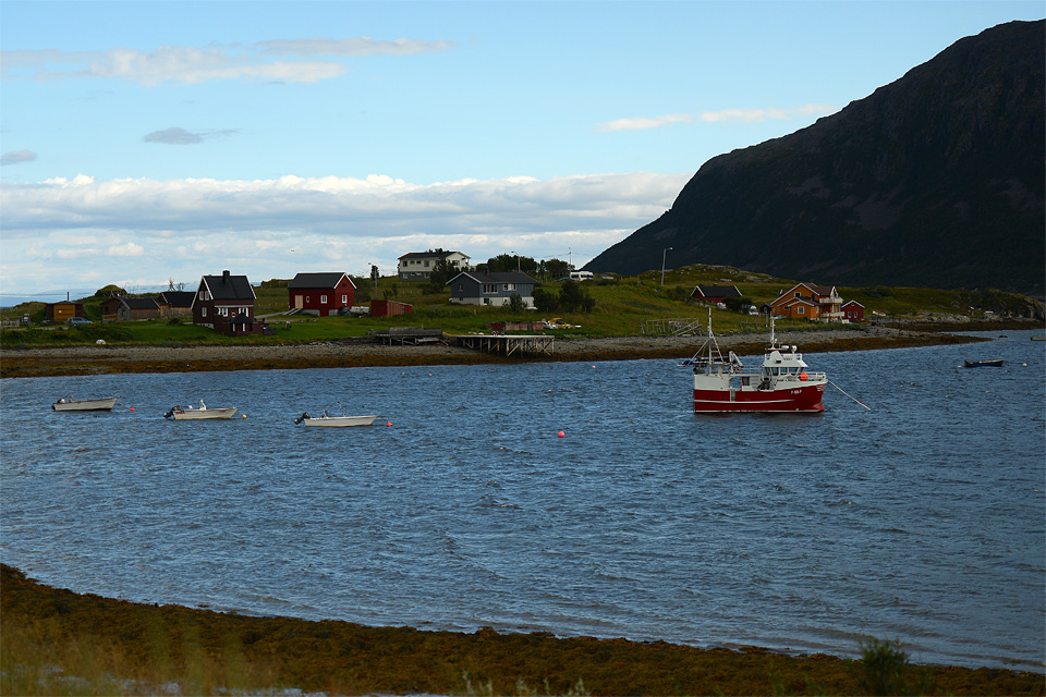 Szóval megszaporodtak a látnivalók. A táj, a tenger nagyon szép, az elszórt, színes faházak nekünk újszerűek, érdekesek. Egy a gond, hogy az út keskeny, a legtöbb helyen nincs felfestve a közepét jelző szaggatott vonal, és a forgalom mellett a szarvasokra is figyelni kell, úgy hogy nekem, sofőrként nehezebb a tájban gyönyörködni. Szerencsére Antal a fényképezőgépével készenlétben ül a jobb egyben, úgy hogy menet közben is meg tudja örökíteni a szebb látnivalókat.