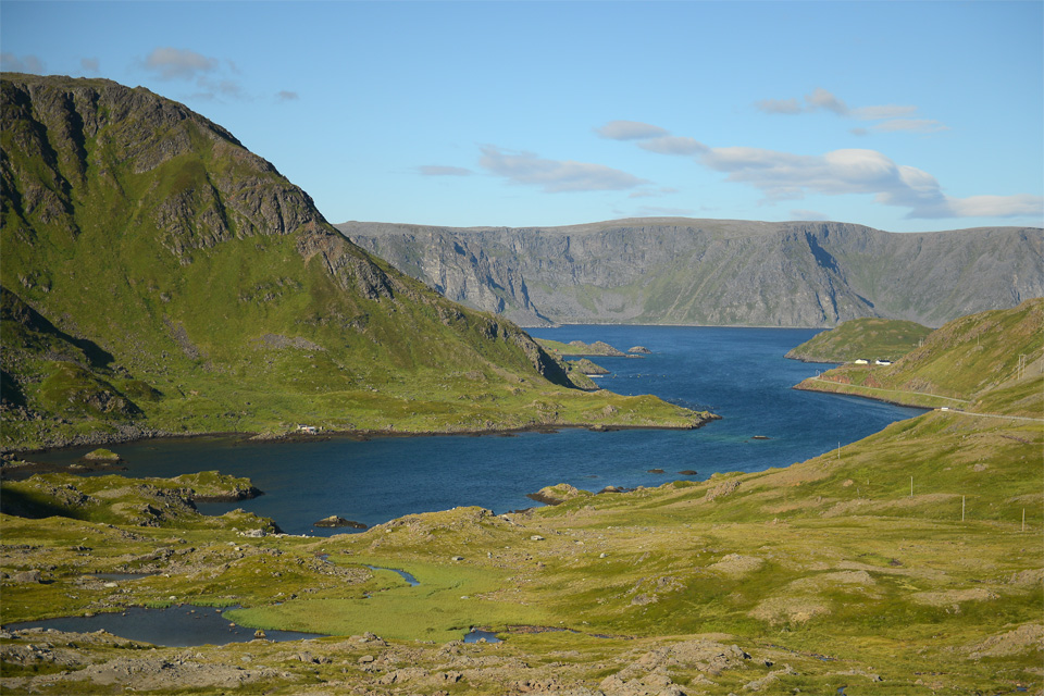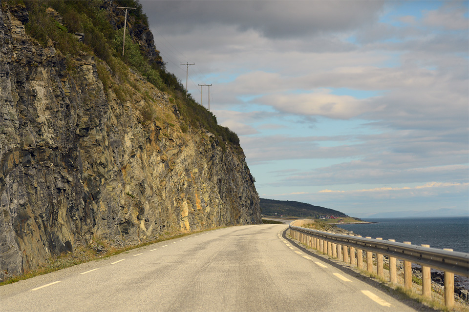 Az este, amikor megérkeztünk, nem tűnt valami szép helynek Lakselv, de amikor elindultunk, láttuk, hogy nem annyira rossz. A fjord mellett húzódó hegyről két vízesés is zubog lefelé, sajnos délelőtt pont árnyékban volt, úgy hogy képet nem tudok mutatni róluk. Aztán szép lassan egyre közelebb került a hegy a tengerhez, és az út nagy részén a sziklás hegyoldal és a tenger között kanyargott az út.