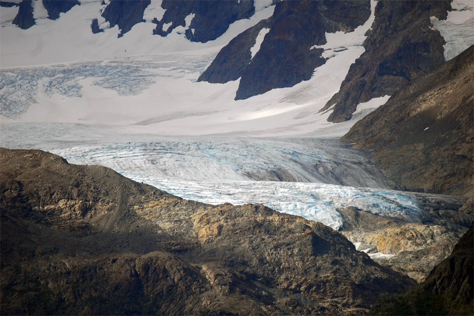 Tovább haladva immár lefelé mentünk. A kis patakocskákból pedig rövid időn belül itt is jókora folyó lett, de ez már sokkal nyugodtabban folyt a fjord felé, mint az észak felé folyó társa. Ezen a szakaszon egyébként dolgoznak, szélesítik az utat, új alagút is épül.