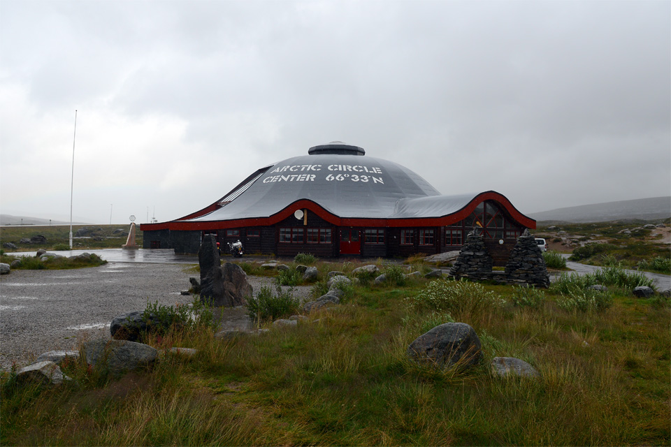 Még egy ideig haladtunk felfelé, a folyó egyre kisebb és kisebb lett, majd el is tűnt, ahogy felértünk a vízválasztó fennsíkra. A Saltfjellet-hegységben voltunk ekkor már egy ideje, Nordland megyében. Ezen a zónán halad át az Északi-sarkkör is, meg is álltunk az emlékműnél, de sajnos ott is esett, és rettenetesen fújt a szél, úgy hogy nem időztünk. Körülnéztünk az ajándékboltban, és végre láttunk egy jávorszarvast, a boltban lévő többi kitömött állat között. Sajnos igazihoz továbbra sem volt szerencsénk, és ahogy haladunk dél felé, úgy csökken az esélye is a találkozásnak.