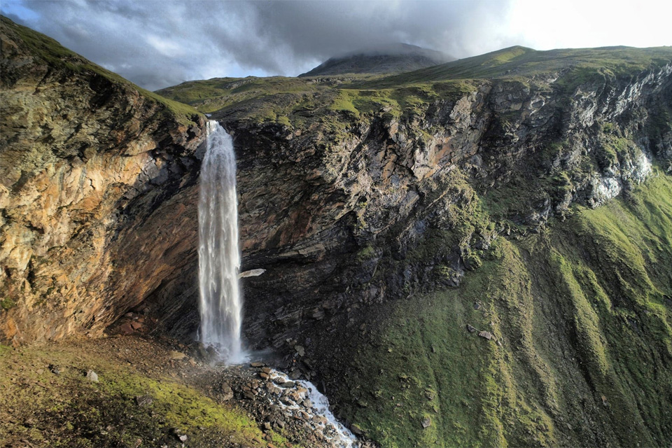Alta után láttuk az első olyan vízesést, amit érdemesnek találtunk arra, hogy megálljunk, és Antal repkedjen egy kicsit körülötte. A felvételt azóta sem láttam, mert késő délután egy olyan kempingnél álltunk meg éjszakázni, ahonnan rá lehetett látni a közeli 64 méter magas helyi vízesésre. A közel végül úgy másfél kilométert jelentett a drón adatai szerint, a tulaj bácsi elmodása szerint pedig úgy 45 percnyi sétával lehet eljutni a vízesés aljához.