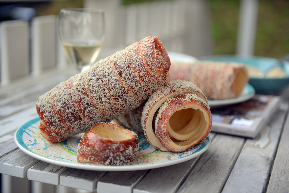 Enikő a teraszon várt. Szerencsére hétfőn szabadnapos volt, úgy hogy otthon tudott maradni, és délutánra egy szintén magyar baráti házaspár is át tudott jönni, találkozni velünk. Annak ellenére, hogy egy napot töltöttünk Sandnessjoen-ben, én nem mozdultam ki a házból. Antal elment Erzsivel lefotózni a fodrászszalonját, és benéztek a Petter Dass-múzeumba is, míg mi Enikővel beszélgettünk, majd tésztát dagasztottunk. Augusztus 20-a lévén ugyanis azt találtuk ki, hogy kürtőskaláccsal ünnepeljünk, úgy hogy délután előkerült a csomagtartóból a Bake’n’Roll, és nekiálltunk sütögetni. A kalács mindenkinek nagyon ízlett, a tűzijáték kezdetéig nagyjából megsütöttük az összeset. A tűzijáték természetesen a TV-ben ment, és fura volt látni, hogy míg Budapesten már teljes sötétség volt, itt jóformán épp csak elkezdett szürkülődni.