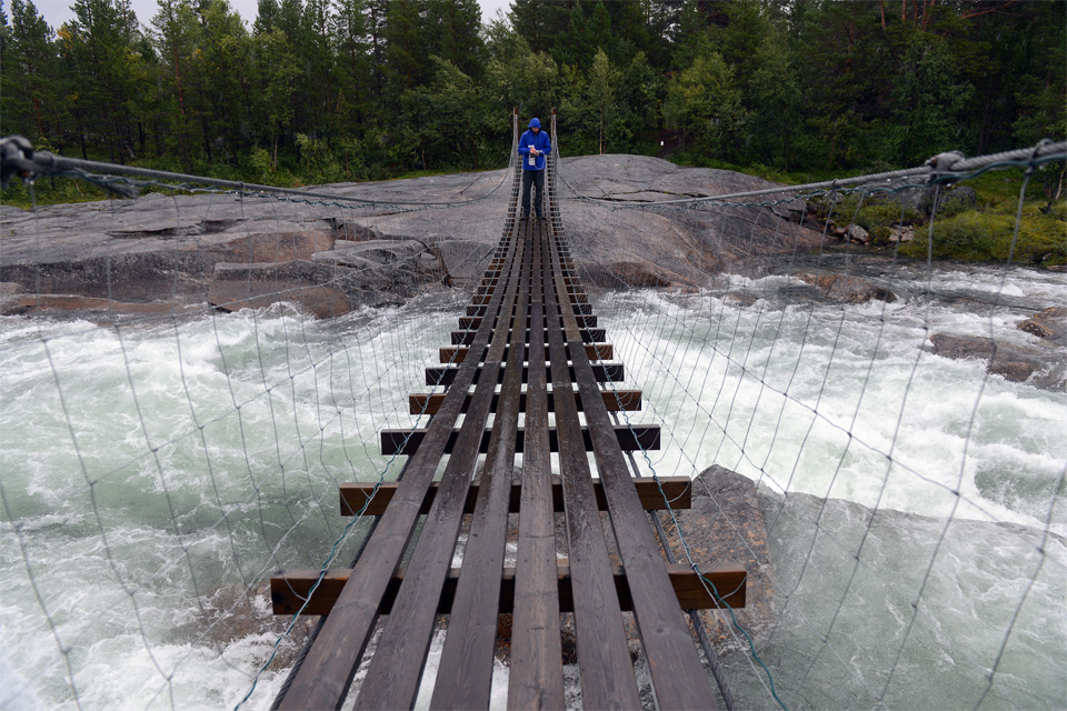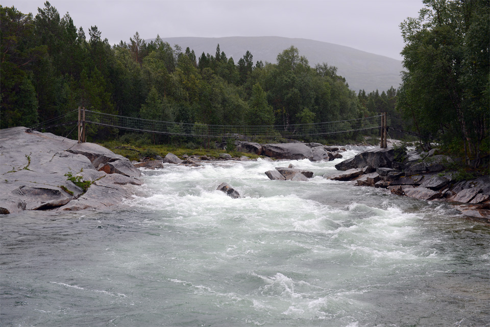Közben újra beborult, mi pedig mentünk tovább. Hol esett az eső, hol nem. Sajnos többnyire, amikor valami jó vízesés mellett haladtunk el, éppen esett. Esett akkor is, amikor a Semska-Stødi természetvédelmi terület mellett haladtunk el, viszont olyan gyönyörű volt a sziklákon bukdácsoló hatalmas víztömeg, hogy meg kellett állnunk. Az eső miatt drónozni nem lehetett, fotózni, telefonnal videózni viszont igen, úgy hogy átkeltem a lengőhídon, és mászkáltam egy kicsit a sziklákon jó ki- meg rálátást keresve, A híd túloldalán, a fák között egyébként egy kijelölt túraútvonal is van, később, valamivel feljebb láttunk egy másik lengőhidat, amin vissza lehet menni az útra, a folyó bal partjára.