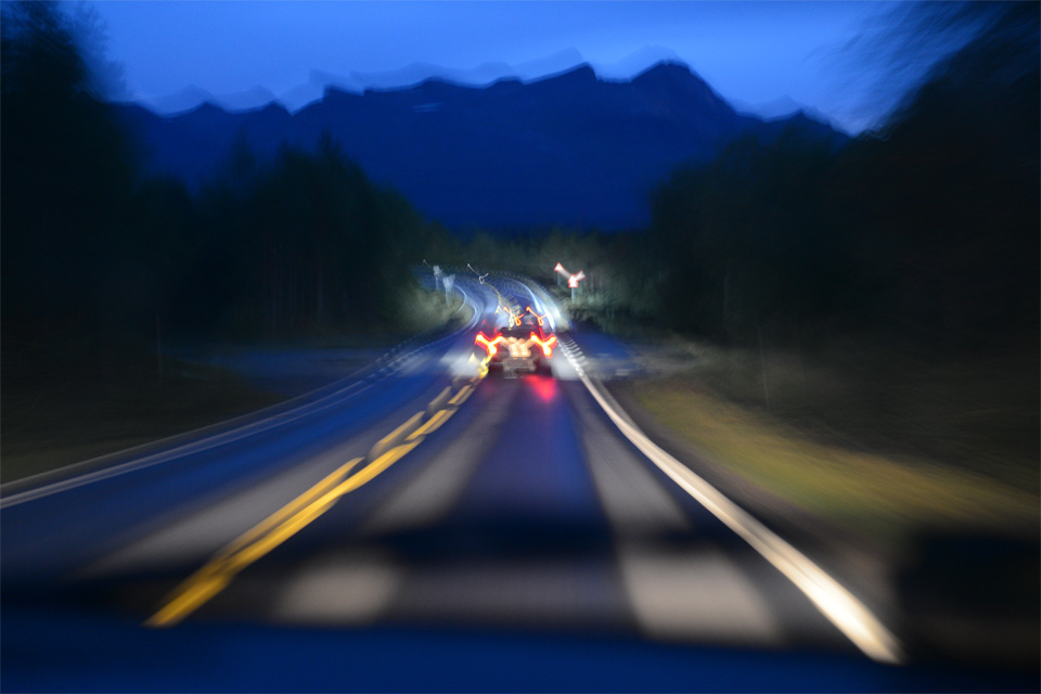 Ezen a napon kompoznunk is kellett, egy egy órás átkelés volt Lodingen és Bognes között. Amikor kikötöttünk, már sötétedett. Norvégiában, főleg északon, télen nagyon sokáig sötét van, így erre fel vannak készülve az autósok. Majdnem minden autón, így a kamionokon és buszokon is erős kiegészítő reflektorok vannak. Egy ilyen reflektorral szerelt régi kombi Merci mögé álltunk be, és kezdetét vette egy két órás üldözéses menet. A Mercis még viszonylag normálisan közlekedett, betartva a sebességlimiteket, utol is ért minket egy kamion. Őt később elengedtem, mégiscsak nagyobb tömeg, jobb, ha elől megy. Ez működött is, amíg a Merci elől volt, de egyszer csak letért, és utána leszakadtam a kamionról, akkor még nem akartam olyan tempót autózni, mint ő. Nem sokkal később utolért egy autóbusz, amit szintén magam elé engedtem. A rövid egyedül haladás alatt rájöttem, hogy az én hosszúfényem elég halvány a ledes fényágyúkhoz képest, és gyorsabban fogunk haladni, ha rátapadok a buszra.