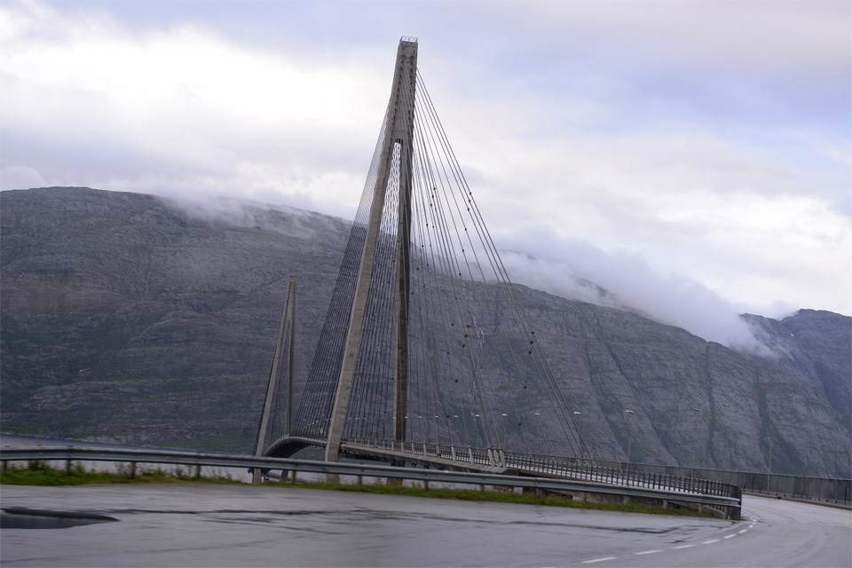 Reggel az első komp 6:25-kor kellett induljon. Háromnegyed hatkor keltünk, szélcsend volt, az eső sem esett, úgy hogy beálltunk a sorba. A komp befutott, behajóztunk, elindultunk, és nem sokkal később ki is kötöttünk Levangban, ahonnan már csak egy ugrás Sandnessjoen. A szigetre egy szép hídon lehet átjutni, amit igen érdekesen alakítottak ki. A híd a fjord közepéig tart, ahol egy zátonyra fut ki az út, majd egy 90 fokos fordulóval a sziget felé fordul, és a zátonyokon kialakított töltésen éri el a szigetet.