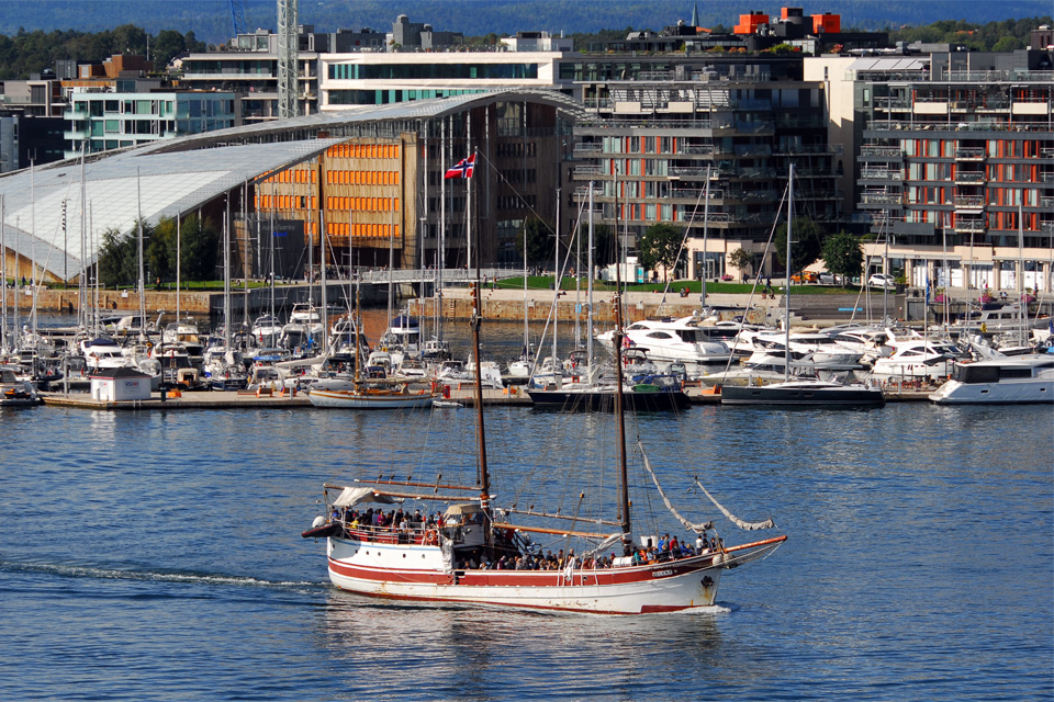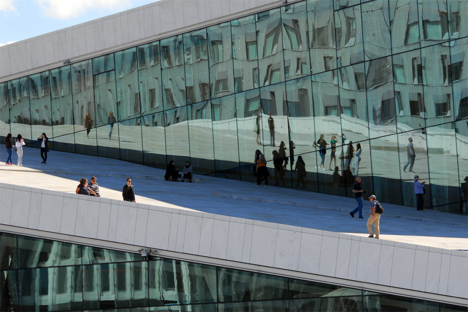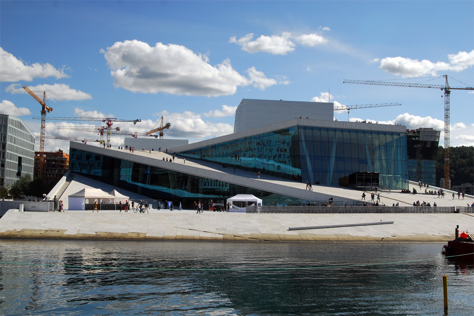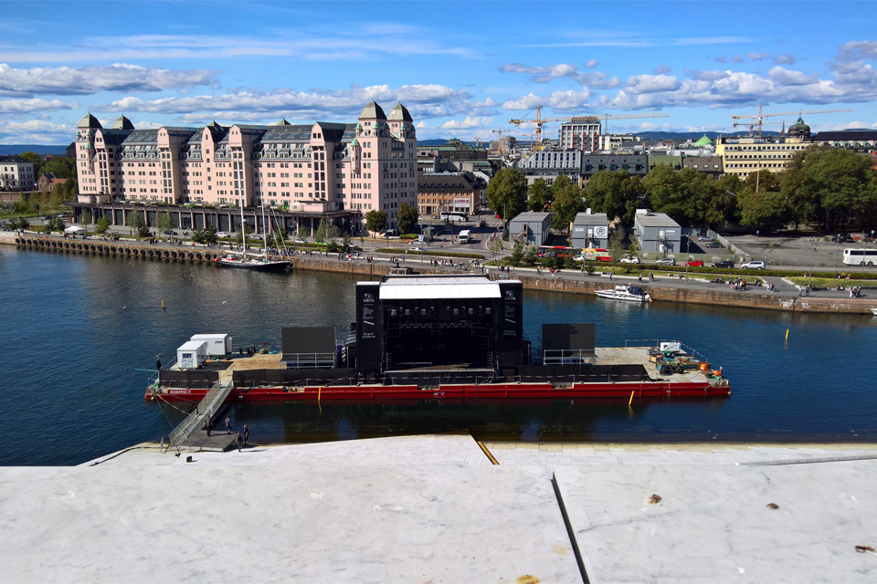 Az erődből az Operaházhoz mentem. A 2007-ben átadott épületet már előző nap is megcsodáltuk, akkor is tele volt emberekkel. Most én is felsétáltam a tetejére, az épület jellegzetességét ugyanis az adja, hogy a tető a föld szintjéről induló emelkedő, ami szinte hívogatja az embereket, hogy felmenjenek, és onnan gyönyörködjenek az oslói panorámába. A „lejtő” nézőtérnek sem utolsó. ugyan előtte az öböl vize van, de most is állt ott egy uszály, amin egy színpad volt, két hatalmas ledfallal, úgy hogy biztos valamilyen koncertre, előadásra készültek.