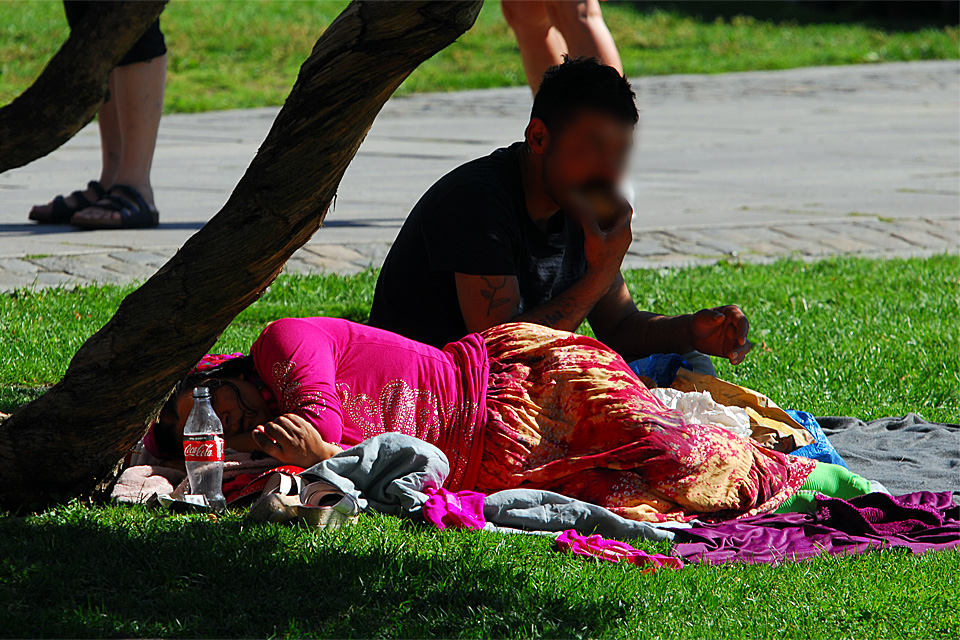 Az egyik sarkon román „vendégmunkások” rövidítették meg a turistákat itt-a-piros-hol-a-piros játékkal, a parkban pedig honfitársaik heverték ki a nehéz munka fáradalmait.