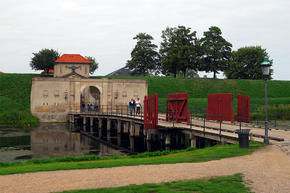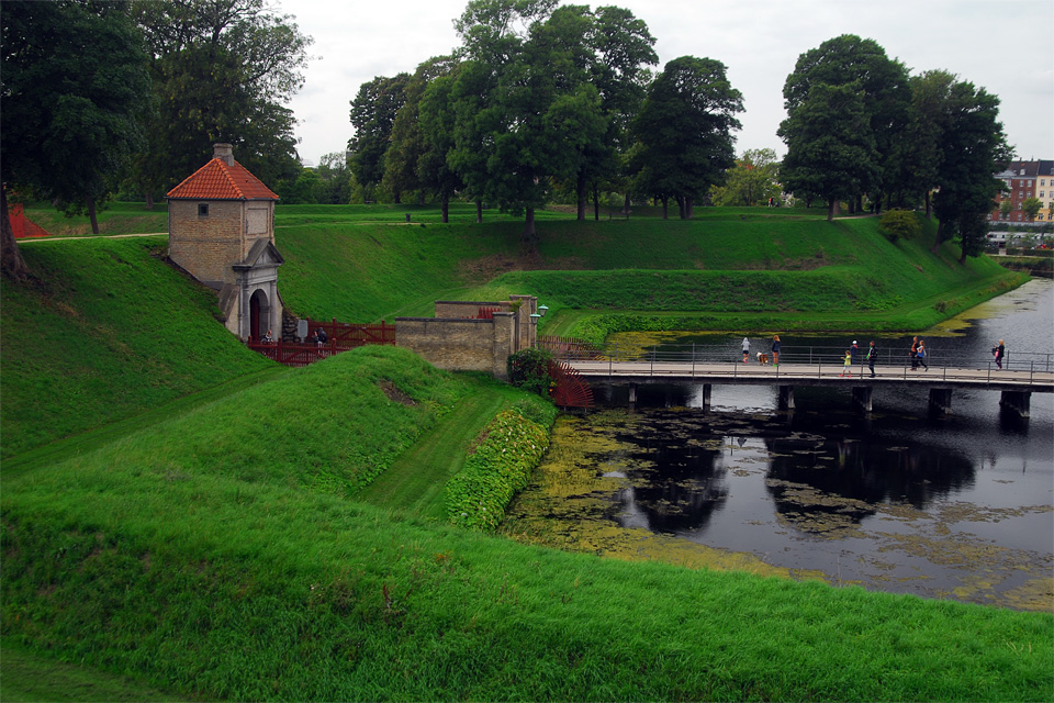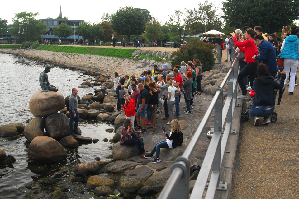 A Déli-kapun mentem be, az Északin jöttem ki, mindkettőhöz híd vezet az erődítményt körülvevő vizesárok felett. Jobbra fordulva lehet eljutni a turistáktól ellepett tenger-partra (öböl-partra), ahol mindenki a kövön üldögélő Kis Hableányt akarja fotózni. Koppenhága legismertebb szobrához a vízen is érkeztek a korábban már említett kabrió-teknők, de nekem más kötötte le a figyelmemet, és most gondolkodom rajta, hogy érdekes lett volna megnézni, mennyire billennek meg, amikor az emberek az egyik oldalára tódulnak, hogy lássák a szobrot.